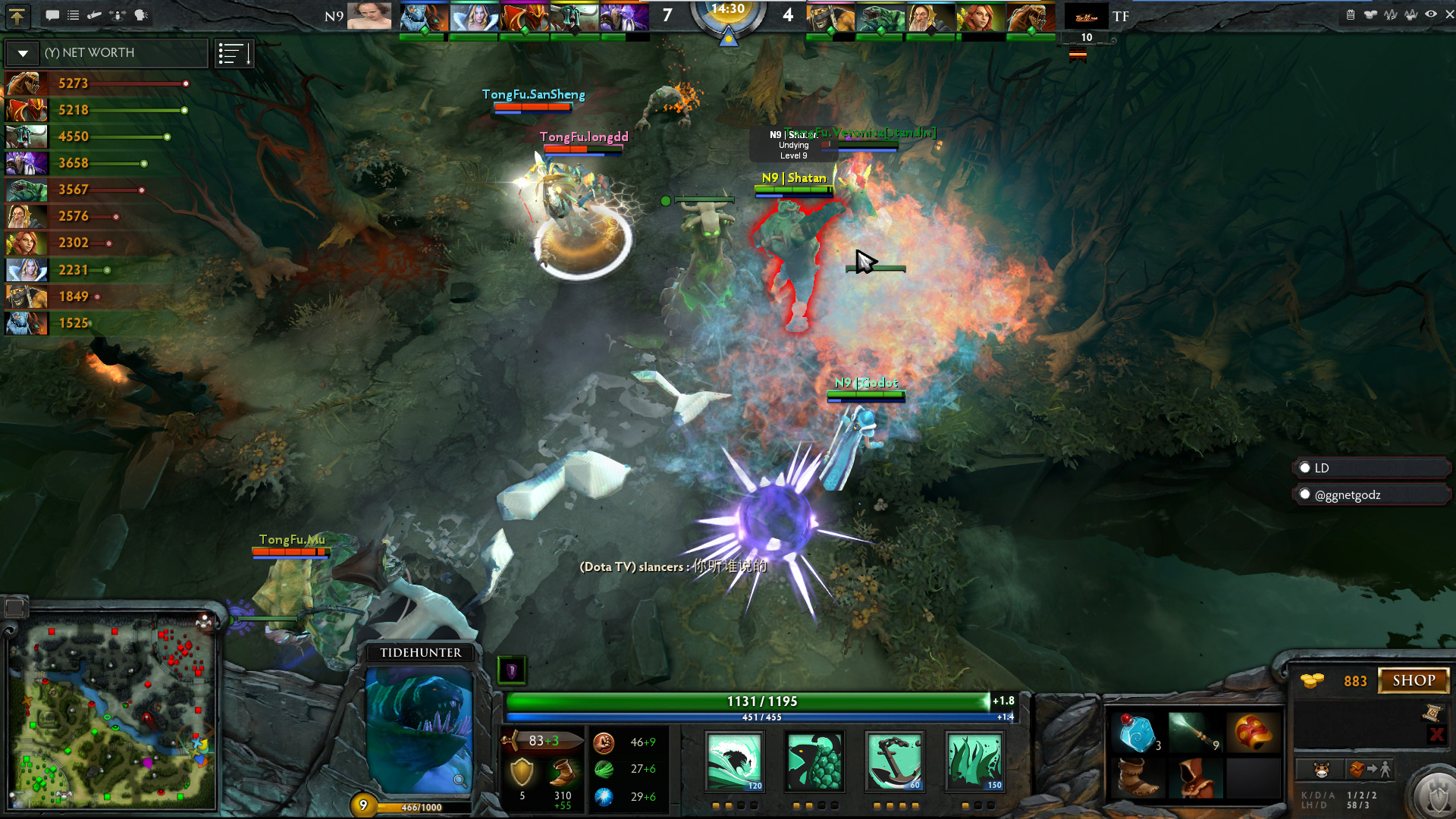 一开场双方都是酱油英雄死保后期,N9这边冰女和龙骑走中路,对线的是同福的暗影萨满和潮汐,下路同福的风行对线N9的**。N9先发制人,上路和下路的两次次游走拿下了同福三个人头,风行也被击杀,从此埋下了悲剧的伏笔。