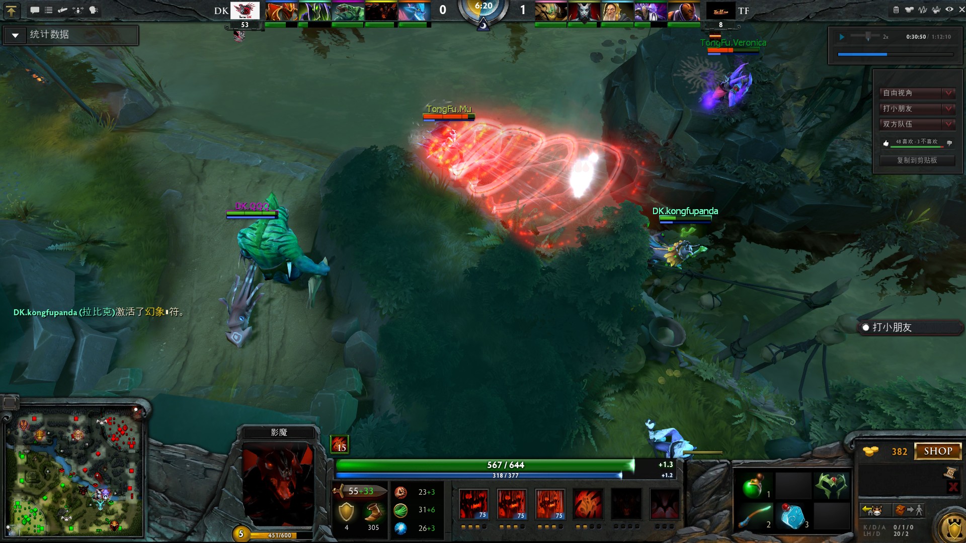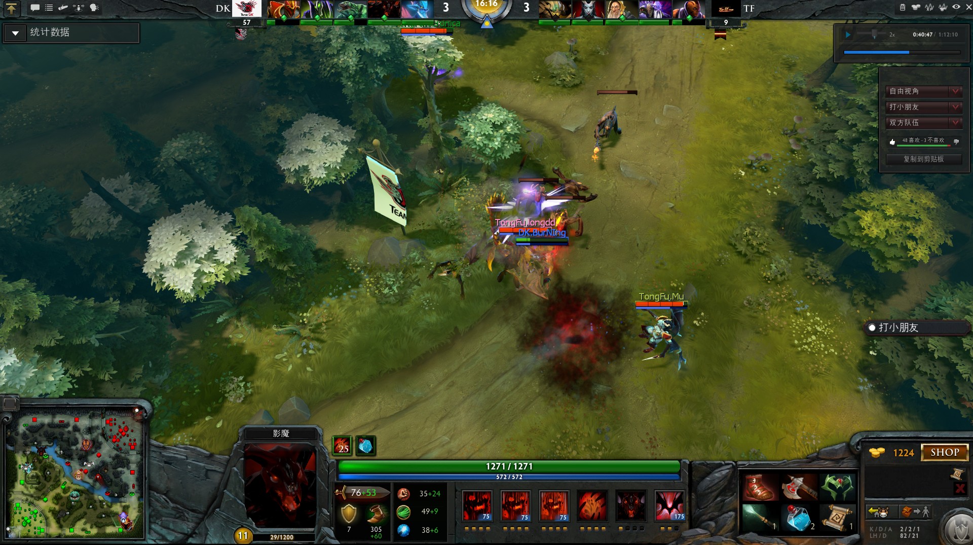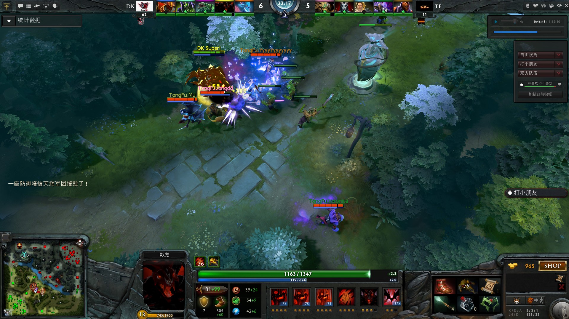 阵容方面,同福在控制方面略有不足,但是AOE充足,守塔比较轻松,如果能让敌法师刷起来,到后期应该是可以抗衡影魔和龙骑士。而DK方面整体上比较合理,在影魔和龙骑士出了BKB后,团战正面将会比较有优势。