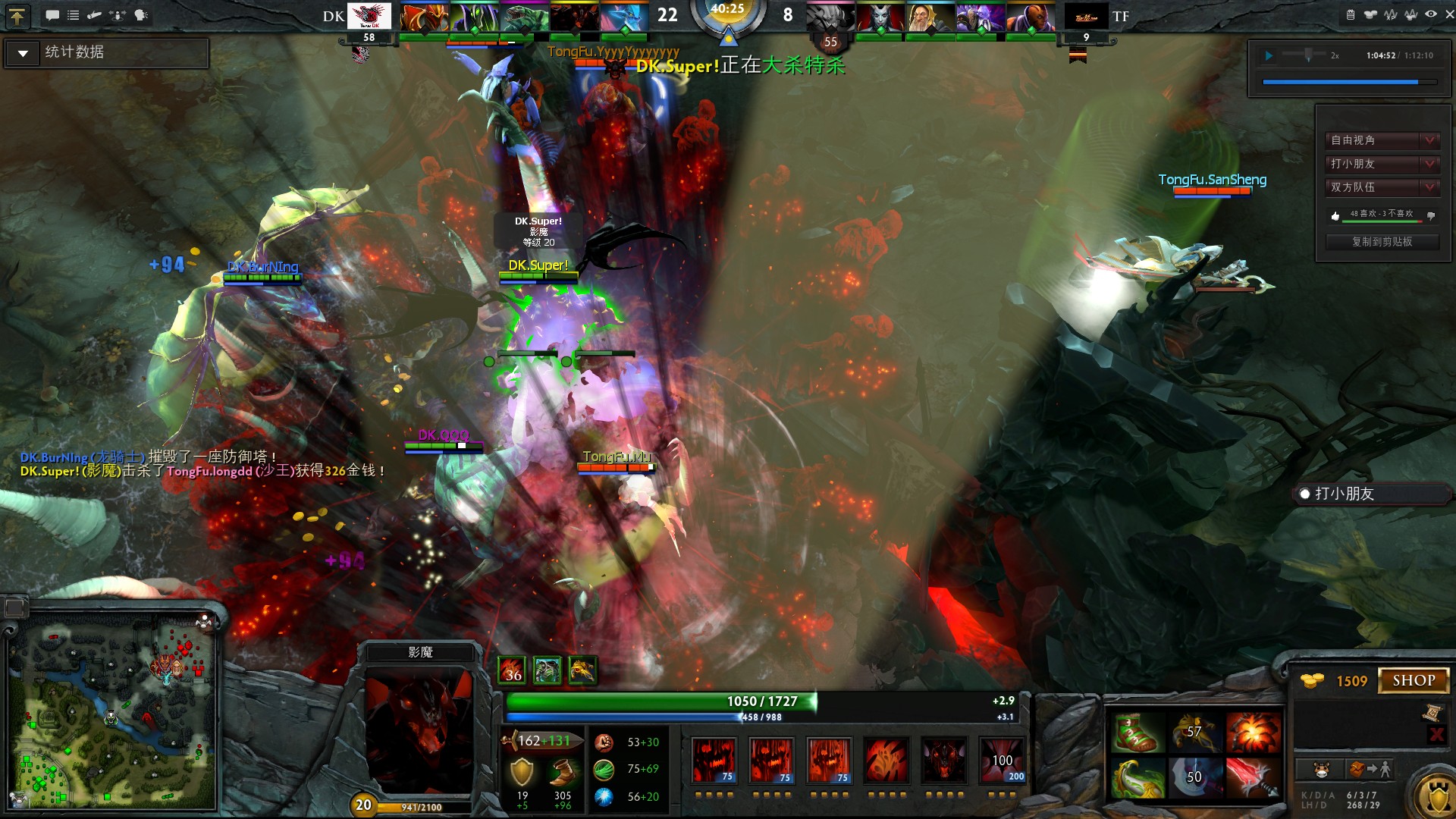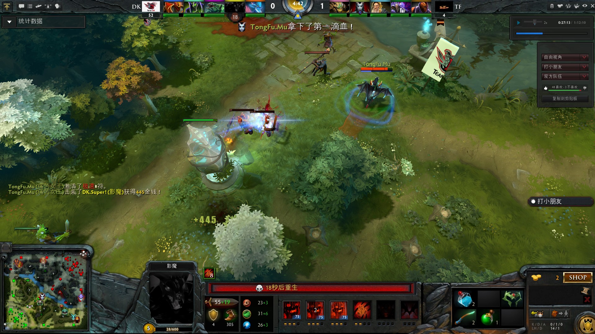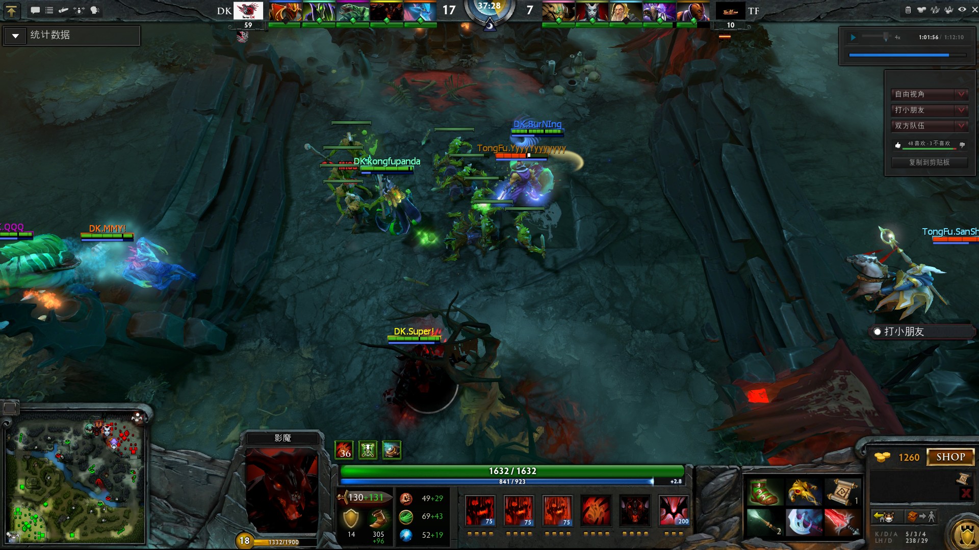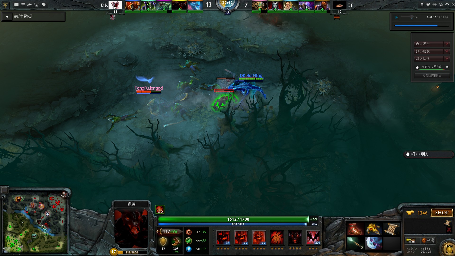 阵容方面,同福在控制方面略有不足,但是AOE充足,守塔比较轻松,如果能让敌法师刷起来,到后期应该是可以抗衡影魔和龙骑士。而DK方面整体上比较合理,在影魔和龙骑士出了BKB后,团战正面将会比较有优势。