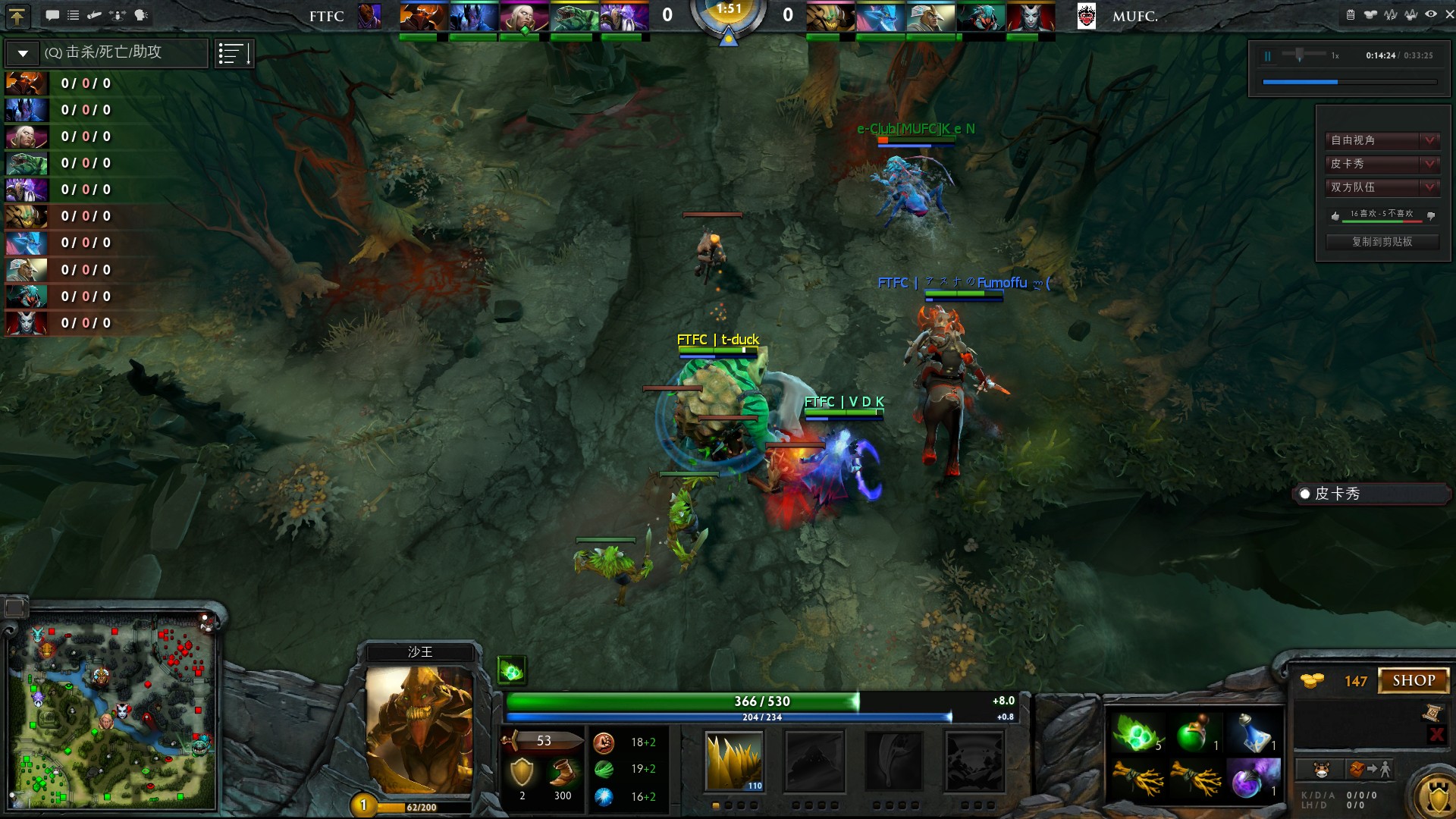 12分钟,FTFC5人打对面4个却只打了个2换2。14分钟MUFC秒掉卡尔之后推上了FTFC的中路高地。