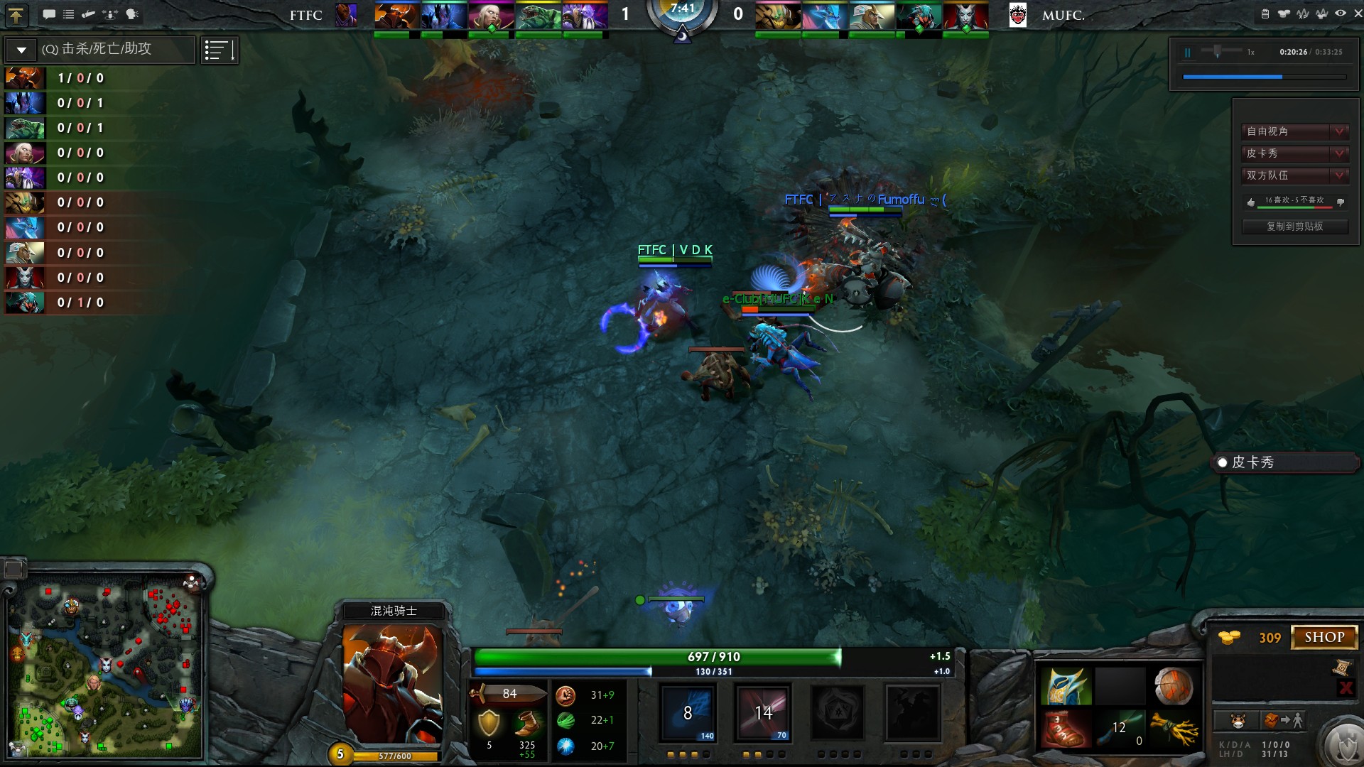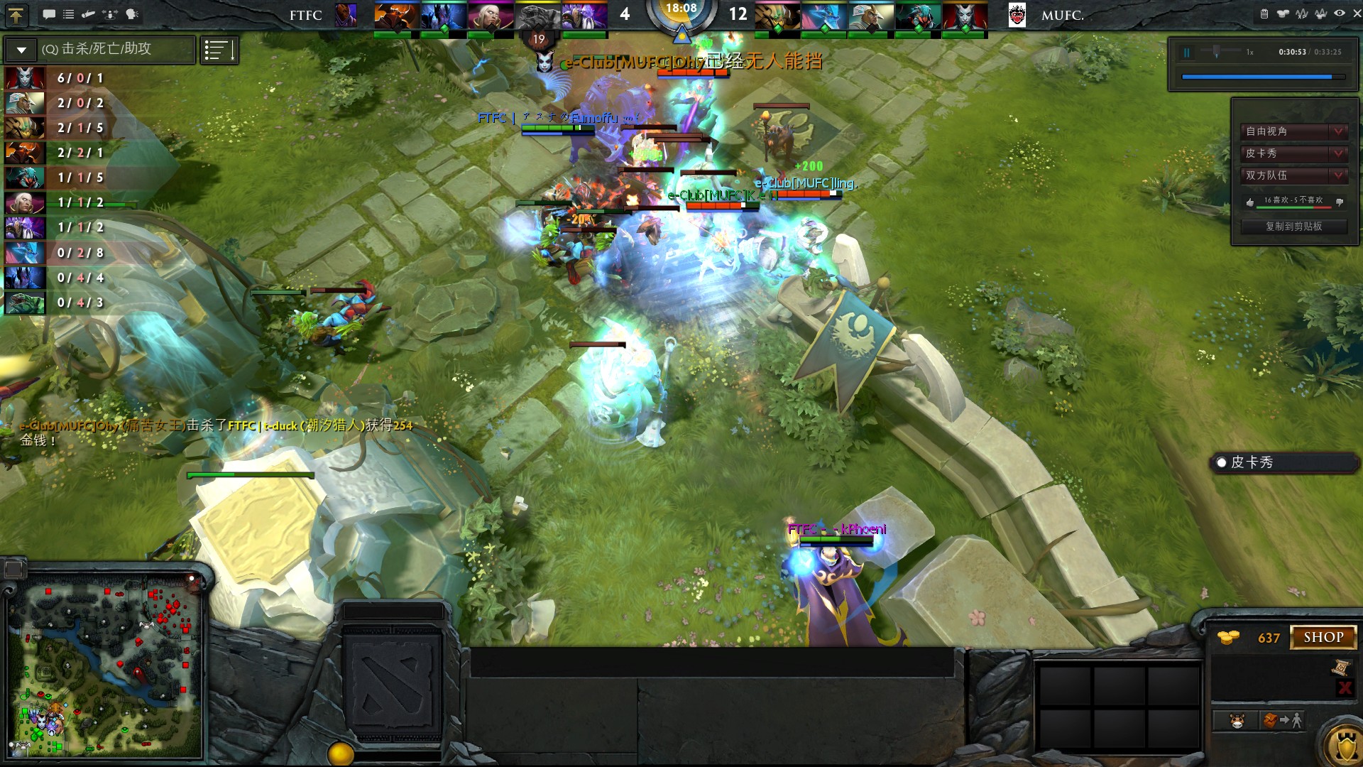 18分钟,MUFC凭借装备和等级上的绝对优势,一波推进FTFC的中路高地,FTFC被打了一波团灭,无奈打出GG。