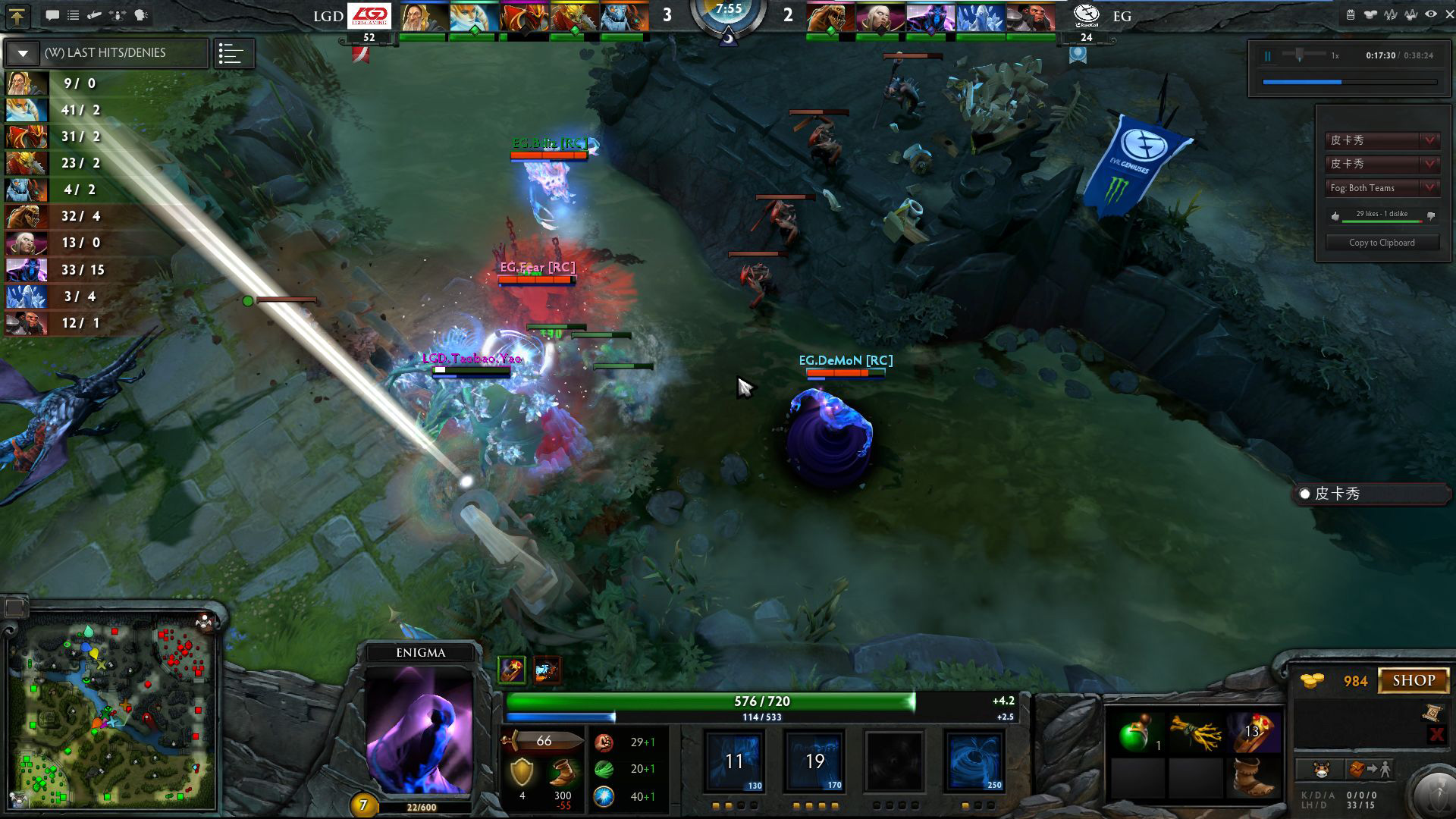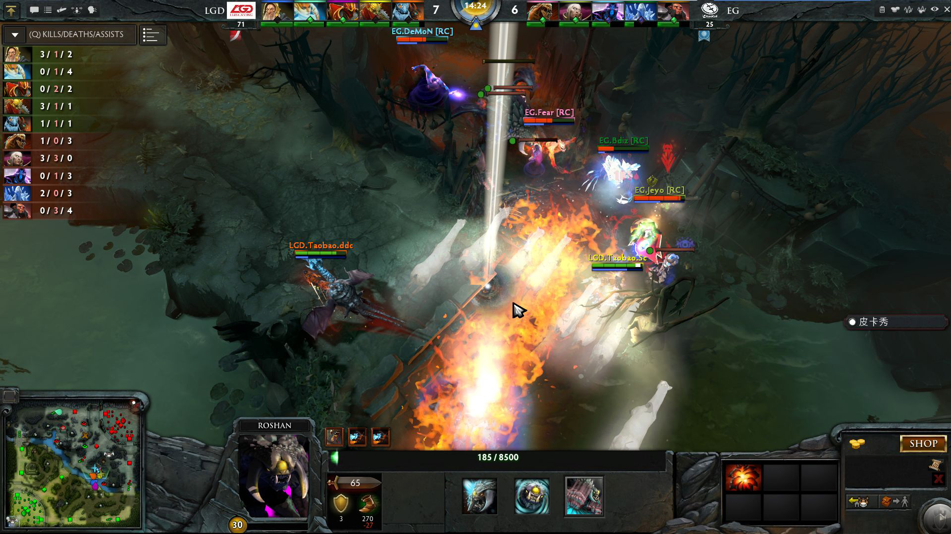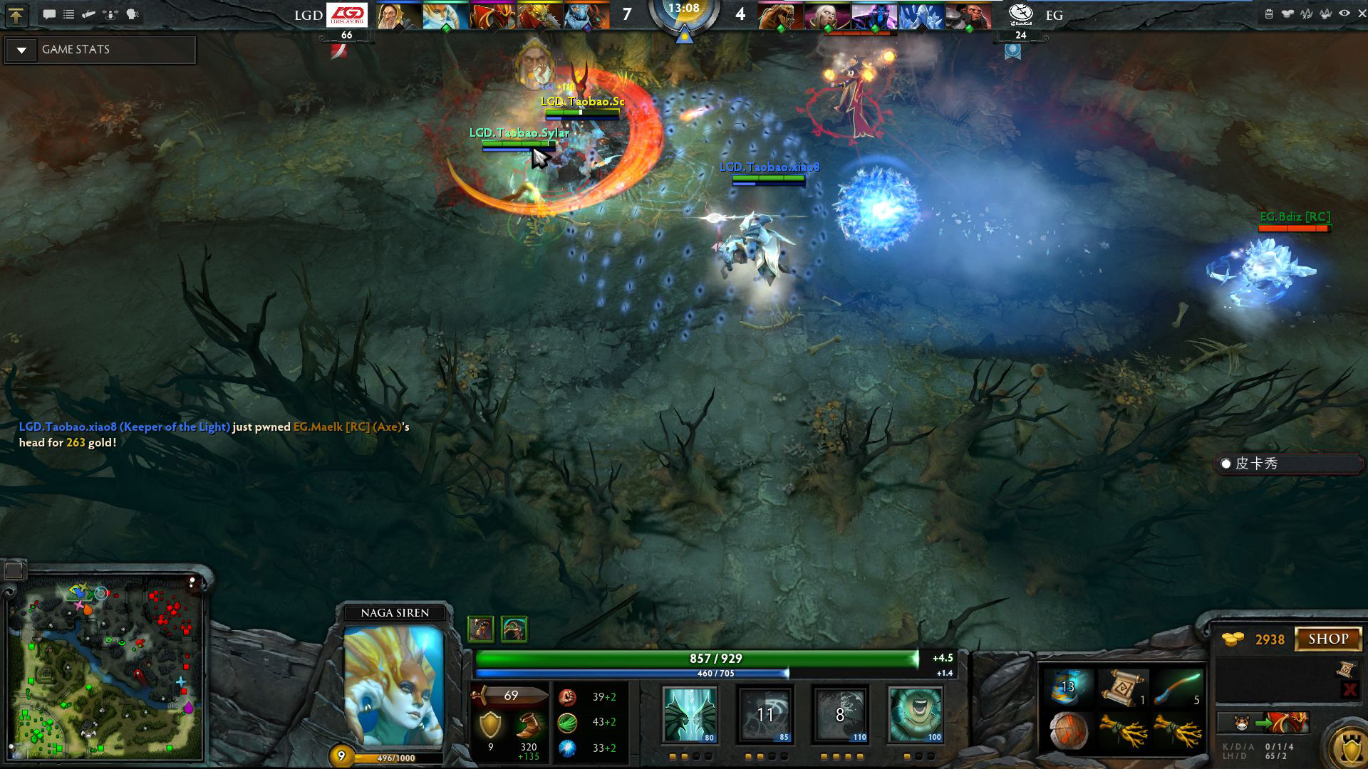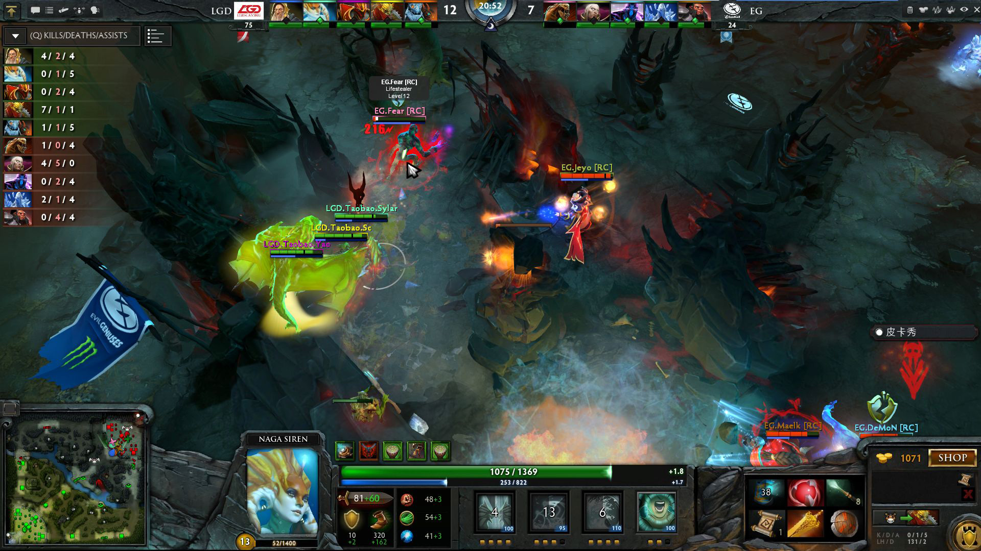 13分钟,LGD和EG在上路发生团战,在冰魂大招的帮助下EG打出了一个1换2,小赚一波,但是小娜迦和龙骑的发育已经基本成型。
