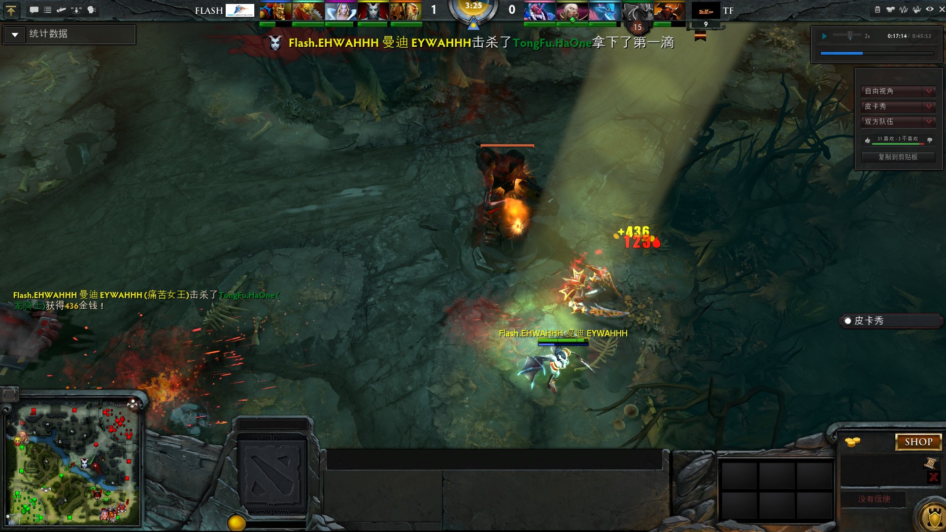 9分钟,双方在tongfu下路一塔打出一波小团子,Flash以一个冰女的代价换掉同福3人,Flash局面逐渐占据优势。