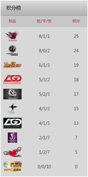 经过了一周的较量后,积分榜上又发生了翻天覆地的变化。在争冠军团中,DK与iG的竞争变得愈发激烈,在连续两轮不胜的情况下,DK领先的优势仅剩1分。积分榜中游,诸强依旧再次陷入混战,Rstars与LGD.int的季后赛资格之争也是紧张的令人窒息。积分榜末尾,Rsnake和WPC.B-HGT在本周都成功获得积分,他们依然保留着冲击季后赛的资格。而WPC.A-TongFu二队到目前已经10轮不胜,按照这支队伍目前的积分和状态来看,他们想要进军季后赛几乎已经不可能完成,如何取得更多的积分是这支新军需要考虑的。