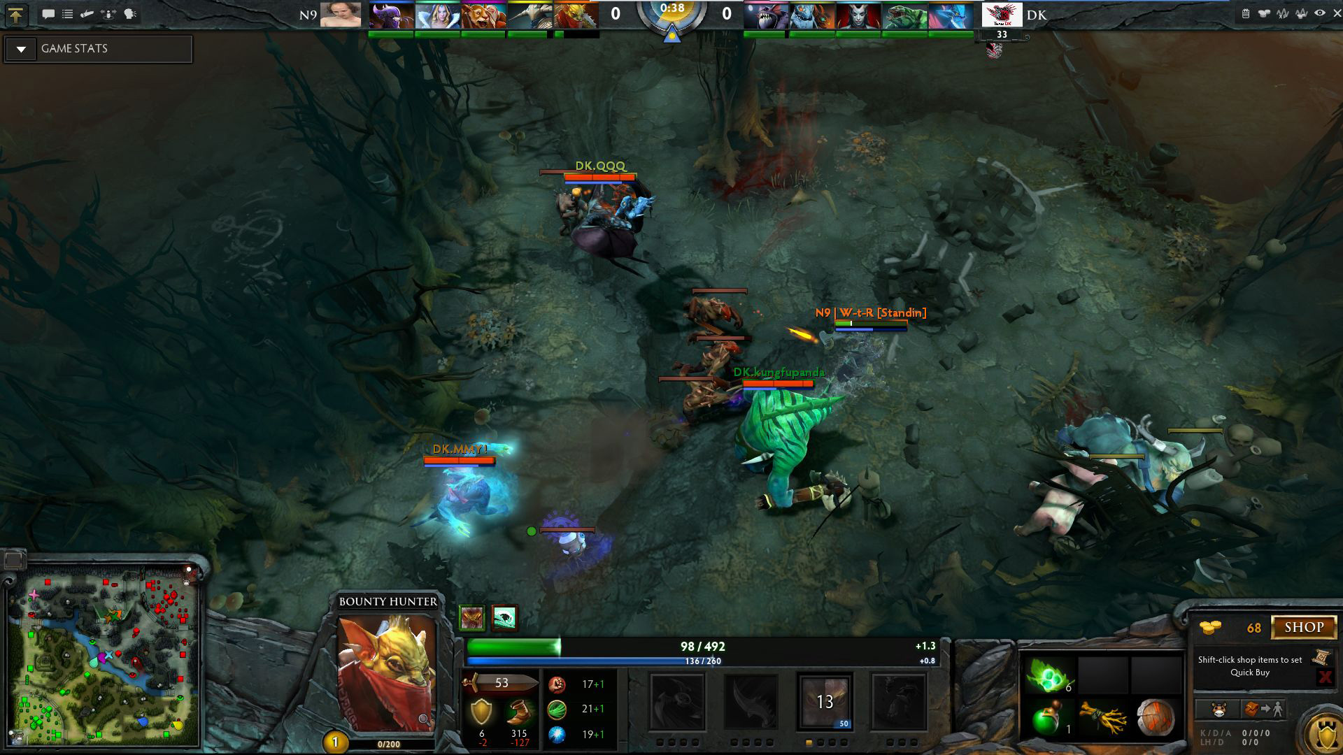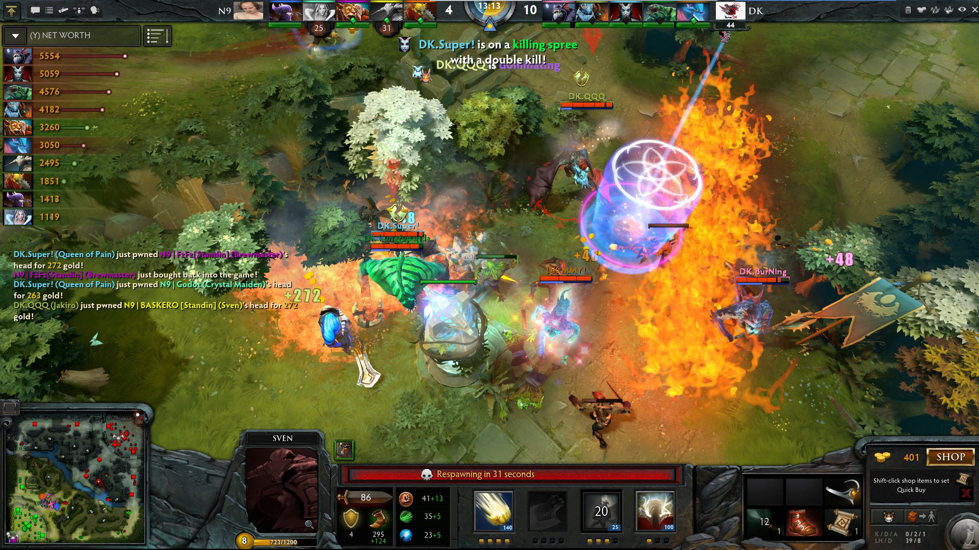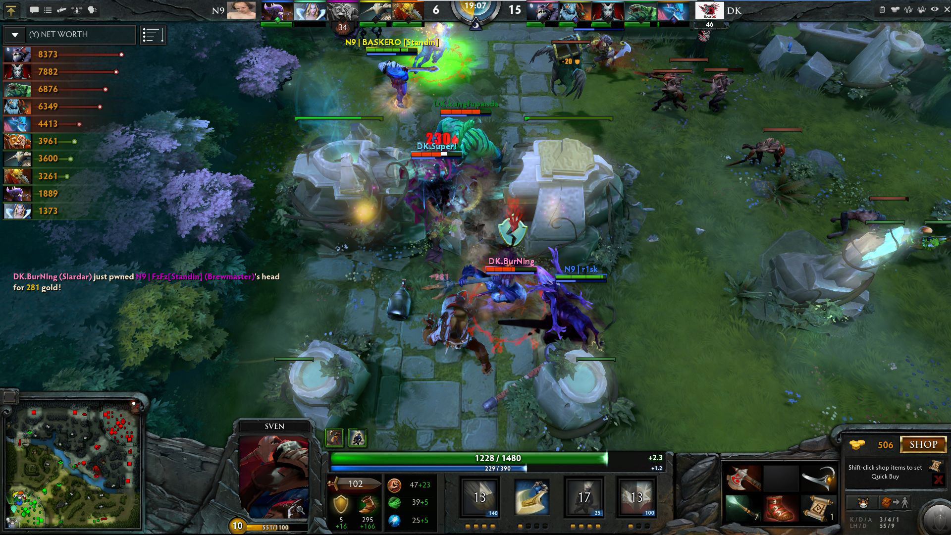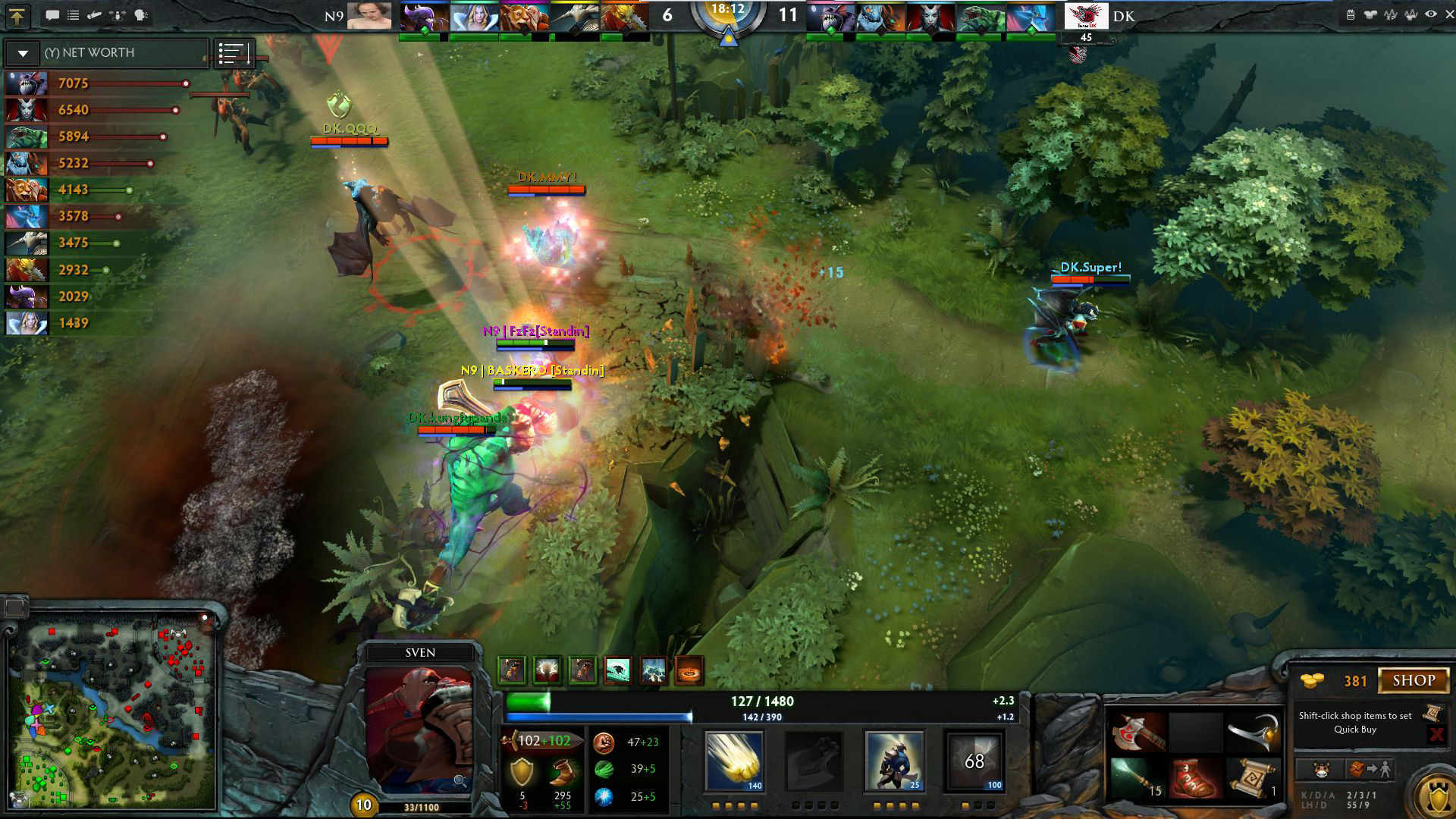 N9自然不会坐以待毙,酒仙冰女和霍乱之源游走到中路顺利击杀了Super的女王,但是这次击杀只是聊以自慰,回头一看赏金已经0-3,而DK优势路超能刷的B神已经无解肥,N9优势路的Sven补刀差距被拉开了一大截,基本功的差距才短短几分钟就显现在经济差距上。