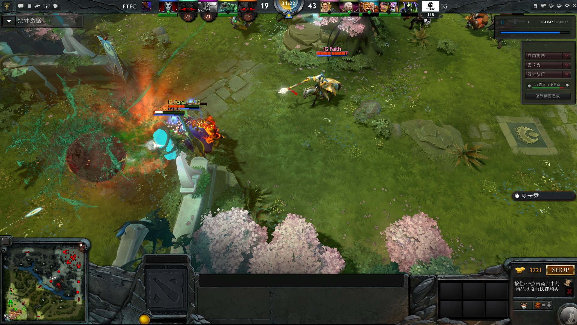 开局42秒,IG流浪剑客迟到隐身符,上路轻松击杀了FTFC的先知,拿下了FB。