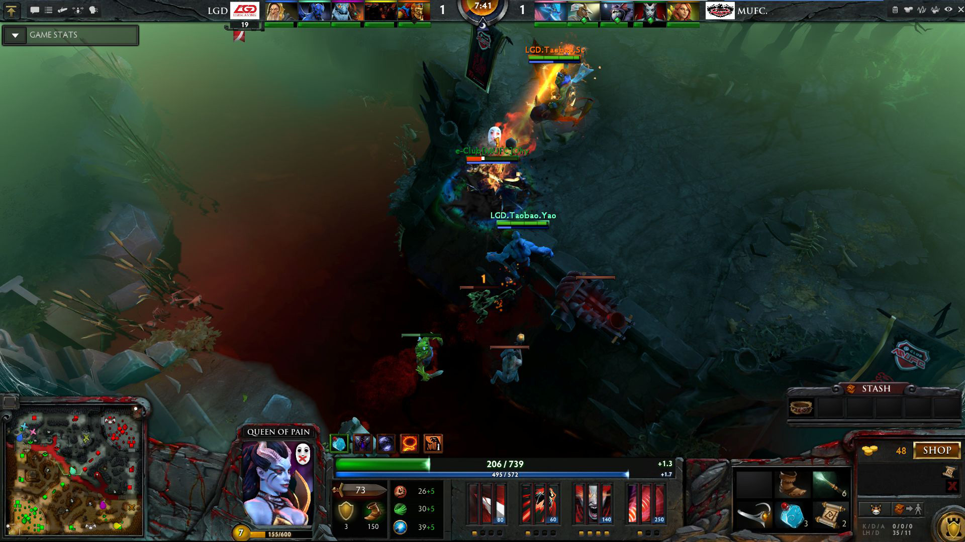 6级之后Gank节奏加快了,先是蝙蝠主动游走,配合中路的夜魔漂亮的击杀了MUFC的女王,短短1分钟后,下路的影魔也主动发难,击杀掉了风行者,MUFC连失两个人头,这不能忍。MUFC迅速在下路集结,LGD后撤,影魔果断躲进树林中TP逃走,夜魔被女王鱼人和TS穷追猛打,在收拾掉夜魔后,LGD的双头龙也没能逃出女王的手掌心,人头3:3,MUFC扳回一城。这时候发生一件有趣的事情,B神上线提示突然出现在直播窗口中,紧接着是同福战队的队员也出现了,B组的两支队伍对LGD尤其关注。