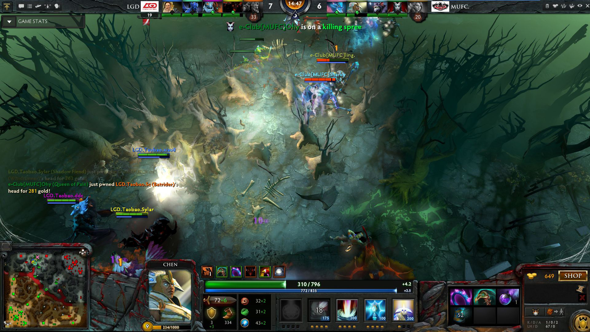 推掉外塔后,LGD顺利推掉肉山,此时金钱差距1万4,MUFC企图开雾抓LGD打肉山的时间点,结果变蝙蝠发现,蝙蝠跳入人群中,不过没能开出大招。蝙蝠被MUFC斩杀的瞬间,LGD四人已经杀到眼前,陈和TS瞬间被秒,有了盾的影魔一心求死不开BKB,复活之后一转身,两个准确的影压收掉风行,MUFC 4人死小团灭,Sylar影魔9杀0死2助攻,堪称近期比赛中最佳影魔,在Sylar超神的怒吼声中,MUFC打出了GG,LGD顺利拿下一局。