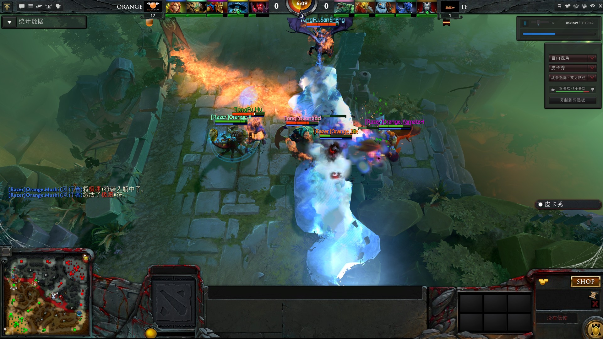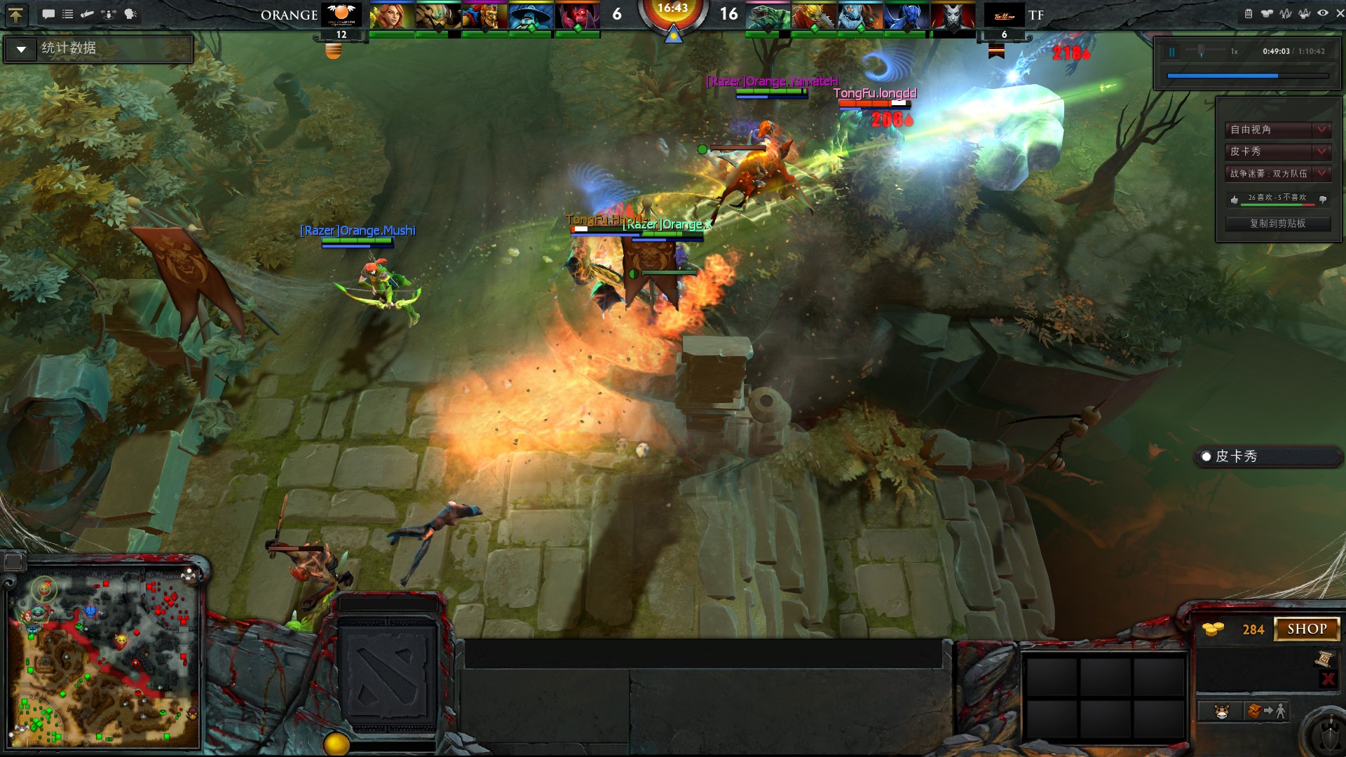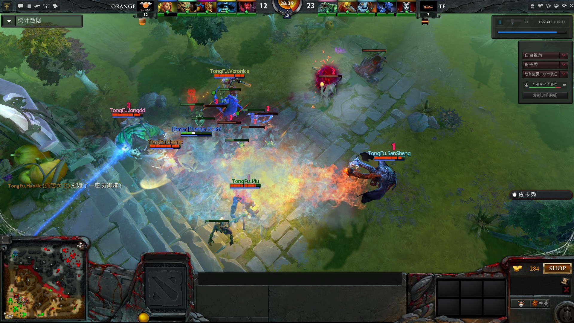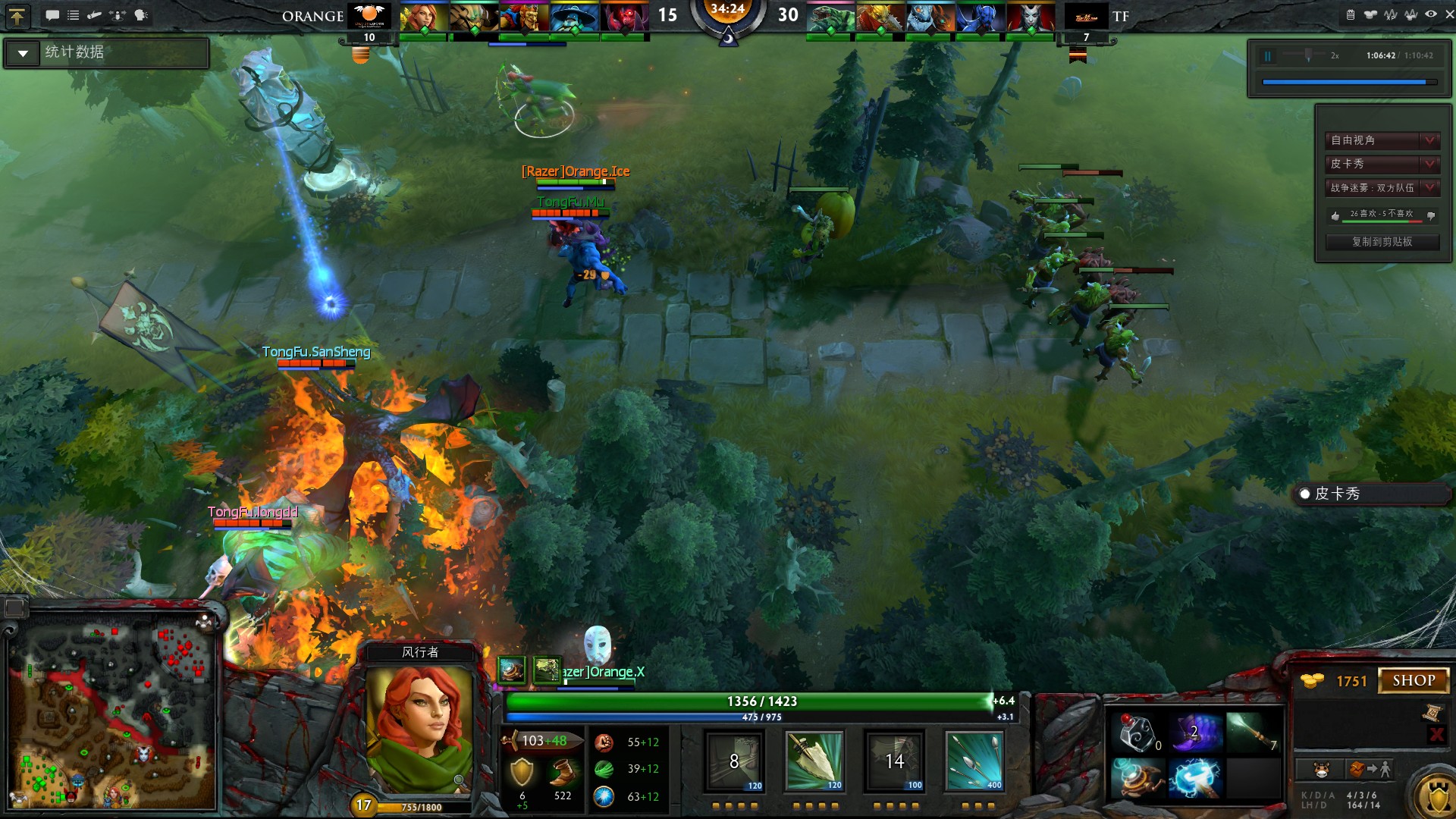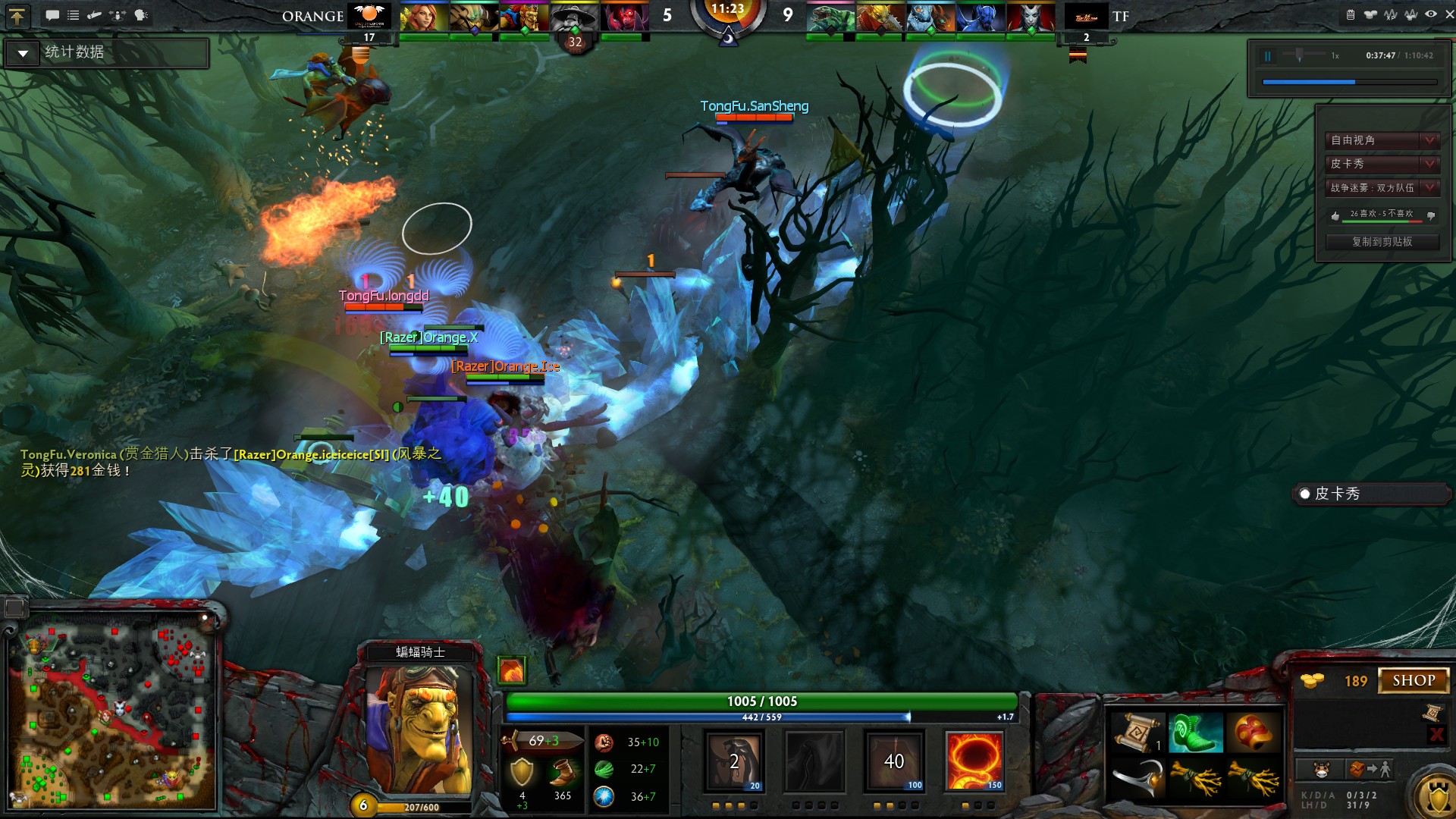 17分钟,Orange利用隐身风行开视野,先手秒掉了豪神的女王,风行一个漂亮的绑捆住了潮汐和女王,之后Orange速**掉了潮汐和双头龙,打了同福一个小团灭。