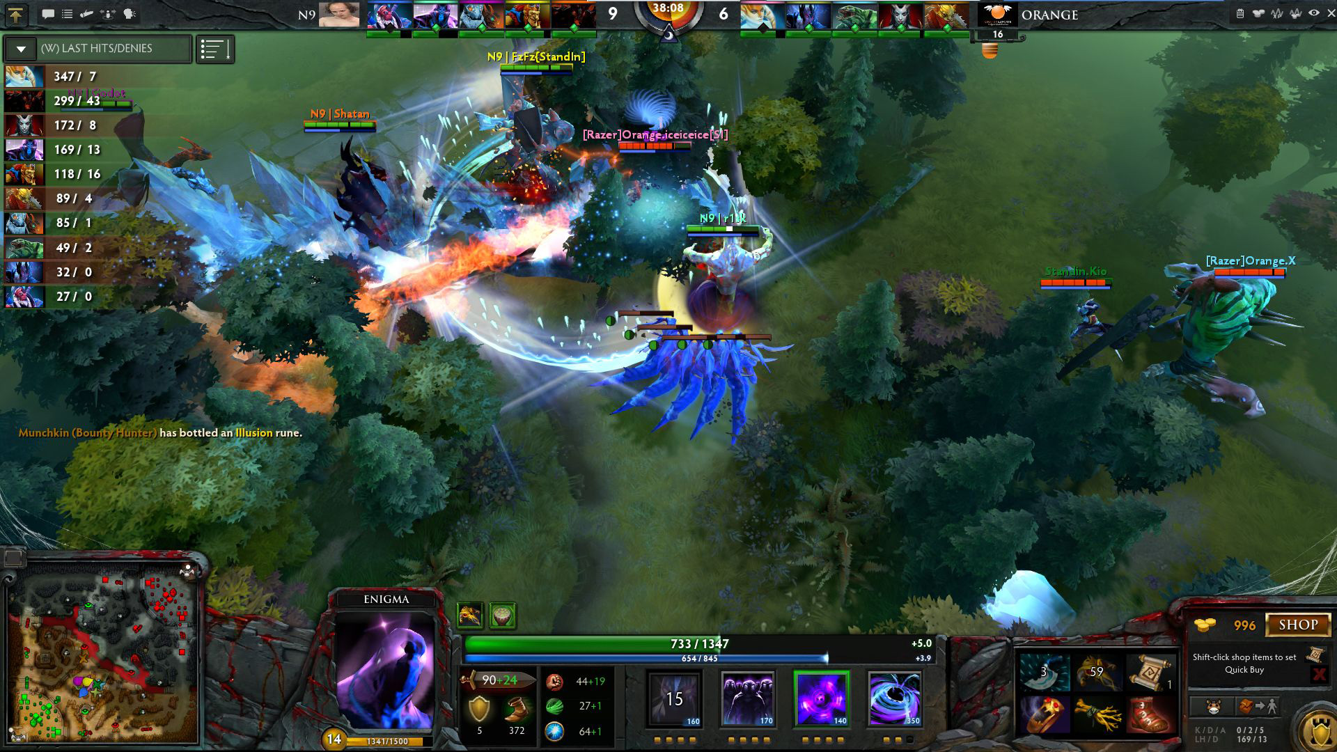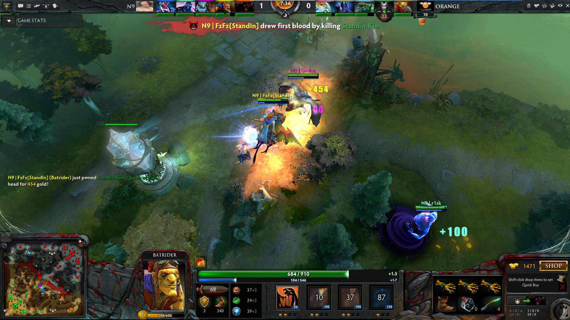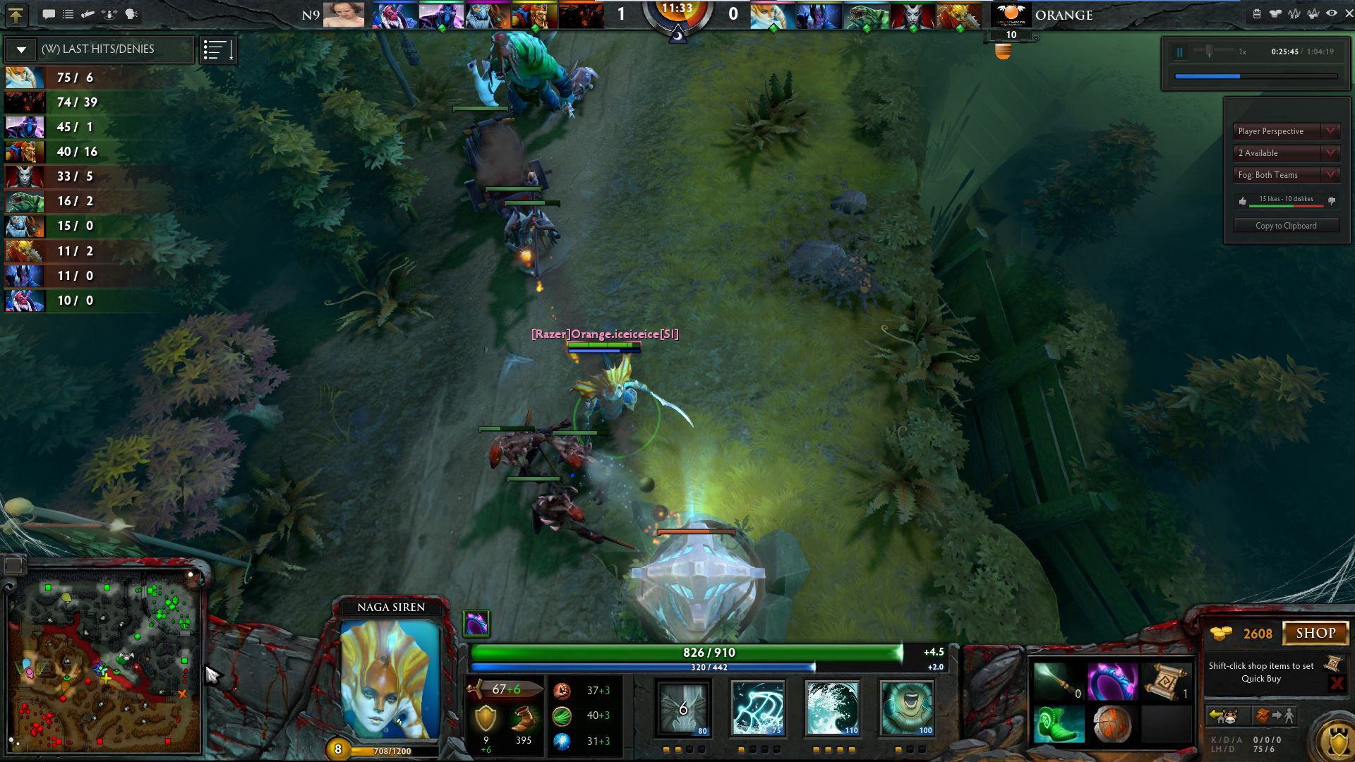 双方的节奏实在是慢到不行,N9本来玩的很浪,这场比赛因为对他们至关重要,突然变得稳重保守了,而橘子换了两个人后,由于配合差距太大,只好采用“外援自己玩儿去”的打法,让外援两个随意打酱油,等三冰刷到开心了才出山,比赛一直进行到7分钟的时候,外援女王终于被蝙蝠抓一次被拿了一血,解说都快要睡着了。虽然N9影魔的优势路发育非常好,补刀暂时第一,不过和昨天的***比起来差距就大了。10分钟,蝙蝠出到跳刀,N9金钱和经验略微领先。