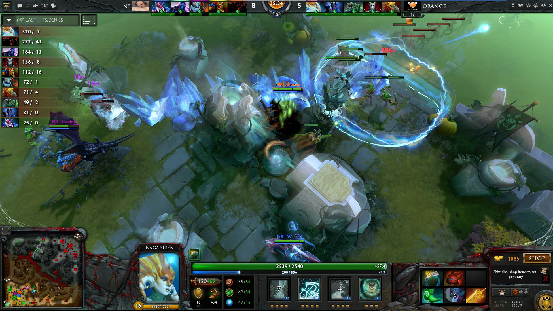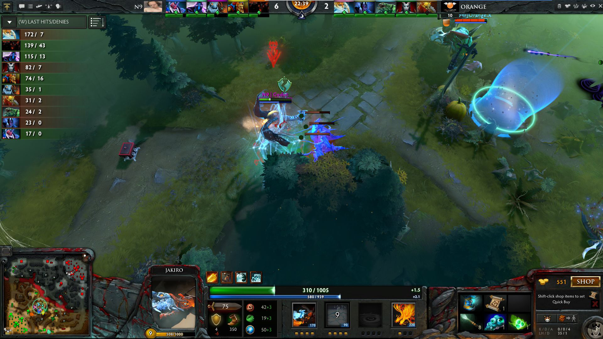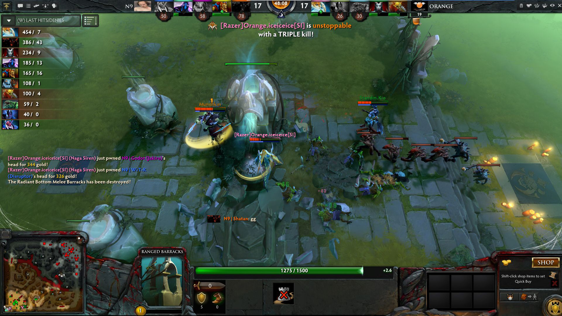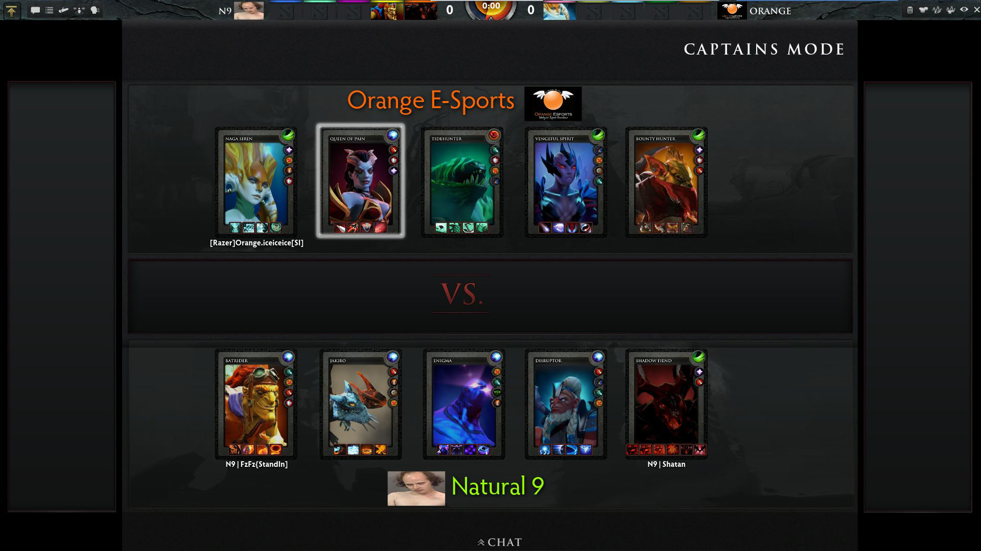 双方的节奏实在是慢到不行,N9本来玩的很浪,这场比赛因为对他们至关重要,突然变得稳重保守了,而橘子换了两个人后,由于配合差距太大,只好采用“外援自己玩儿去”的打法,让外援两个随意打酱油,等三冰刷到开心了才出山,比赛一直进行到7分钟的时候,外援女王终于被蝙蝠抓一次被拿了一血,解说都快要睡着了。虽然N9影魔的优势路发育非常好,补刀暂时第一,不过和昨天的***比起来差距就大了。10分钟,蝙蝠出到跳刀,N9金钱和经验略微领先。