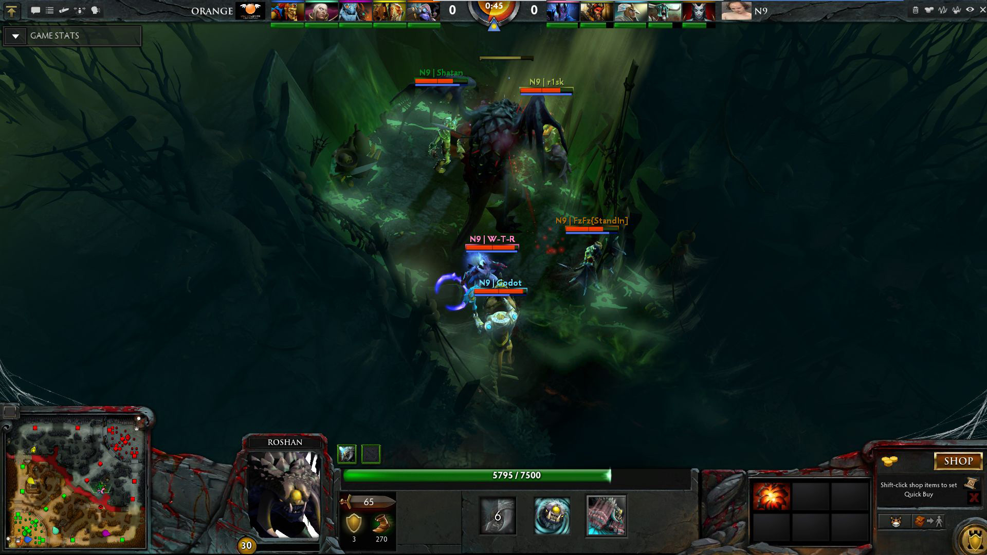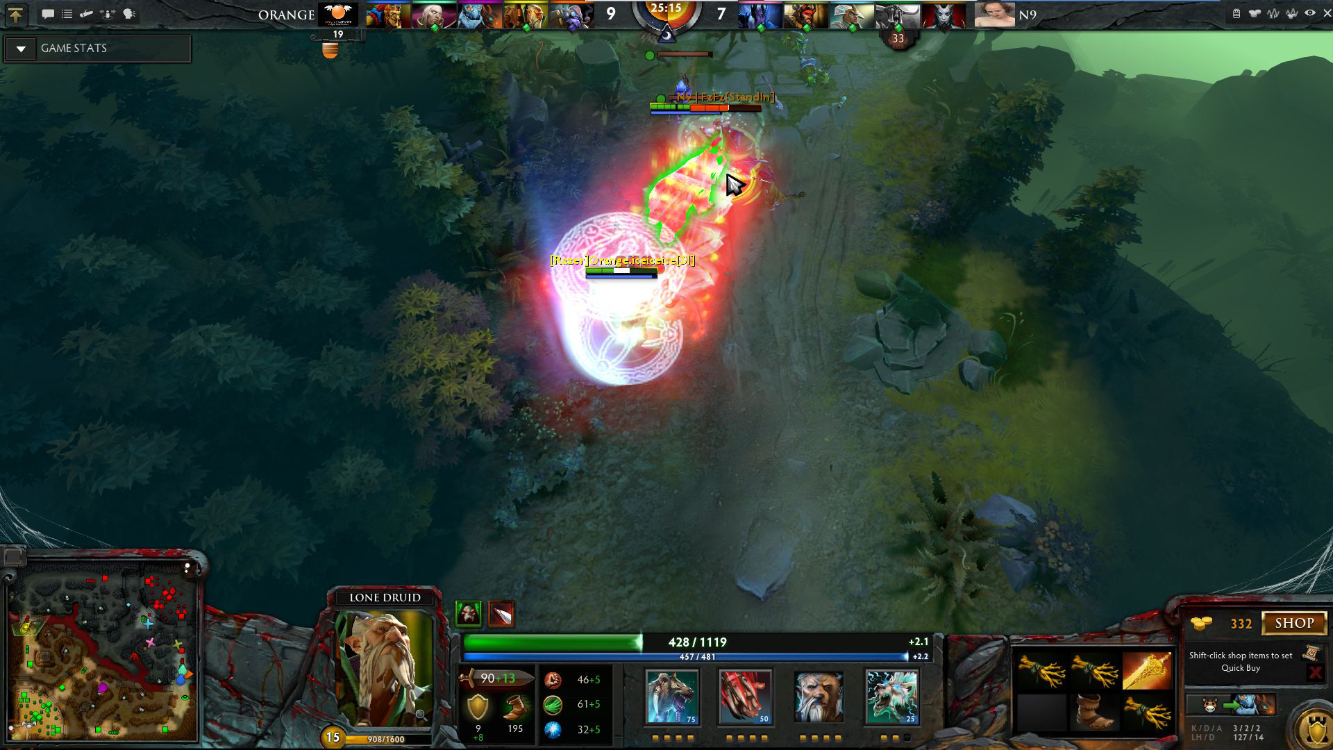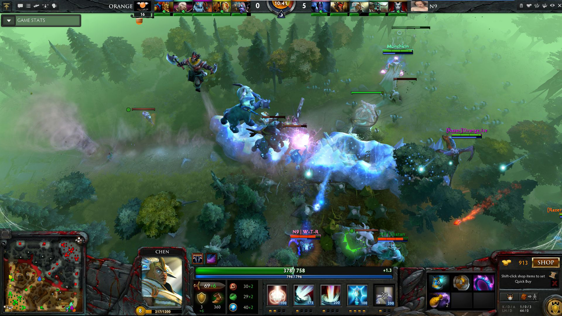 N9开场开大招,开雾速度1级打肉山,虽然让人看得着急,在消耗掉了两个大药膏后,还是顺利的打掉了肉山,五人全部升到2级,经济领先1000。