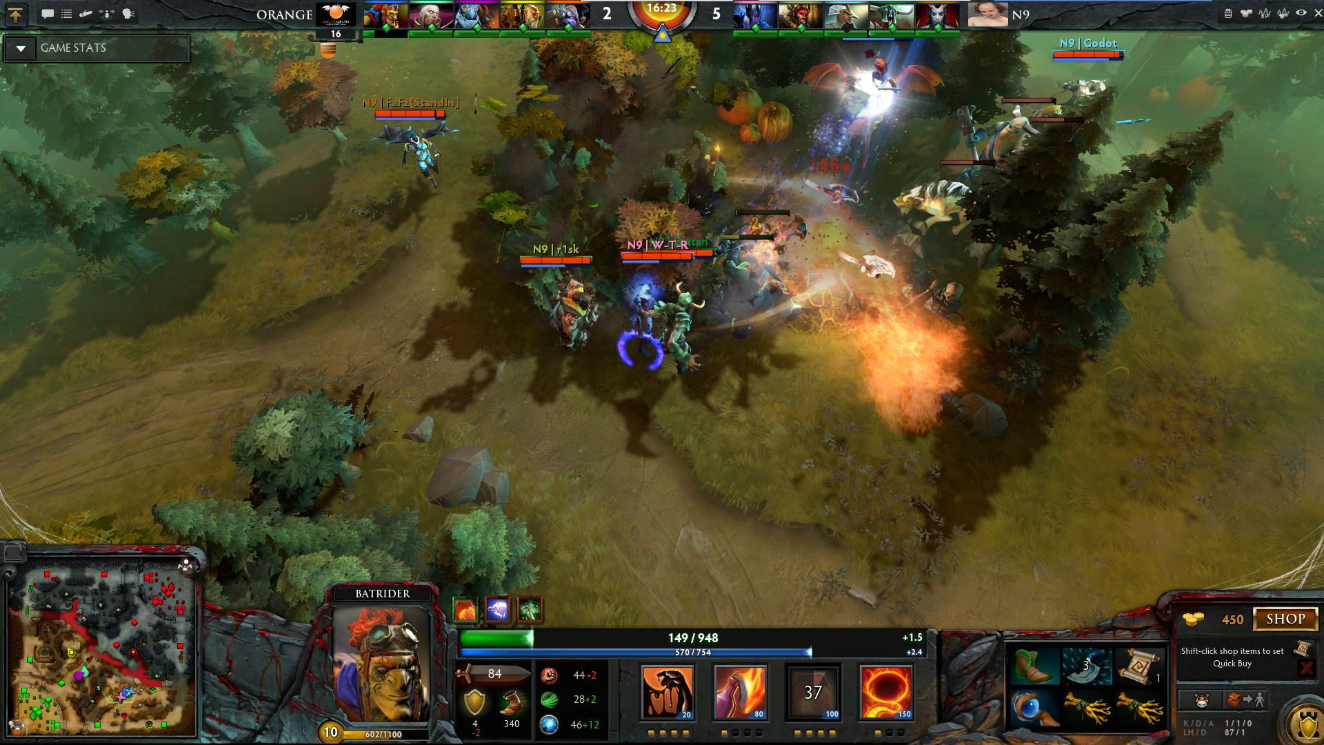 23分钟橘子没有再拖延,逼迫N9开打,虽然自己的双头龙先被秒掉,三冰转头**掌杀死VS和尸王,TK已经用自己的跳刀和飞鞋进行了无法无天的推进,一群人杀入N9的主基地,复活的N9再次与橘子爆发团战,女王先惨死,TK跳入阵中疯狂扔技能,N9溃败,VS逃走死4人,三冰甚至直接到对方泉水中卖骚,N9士气尽失,塔还没有被推就打出了GG。