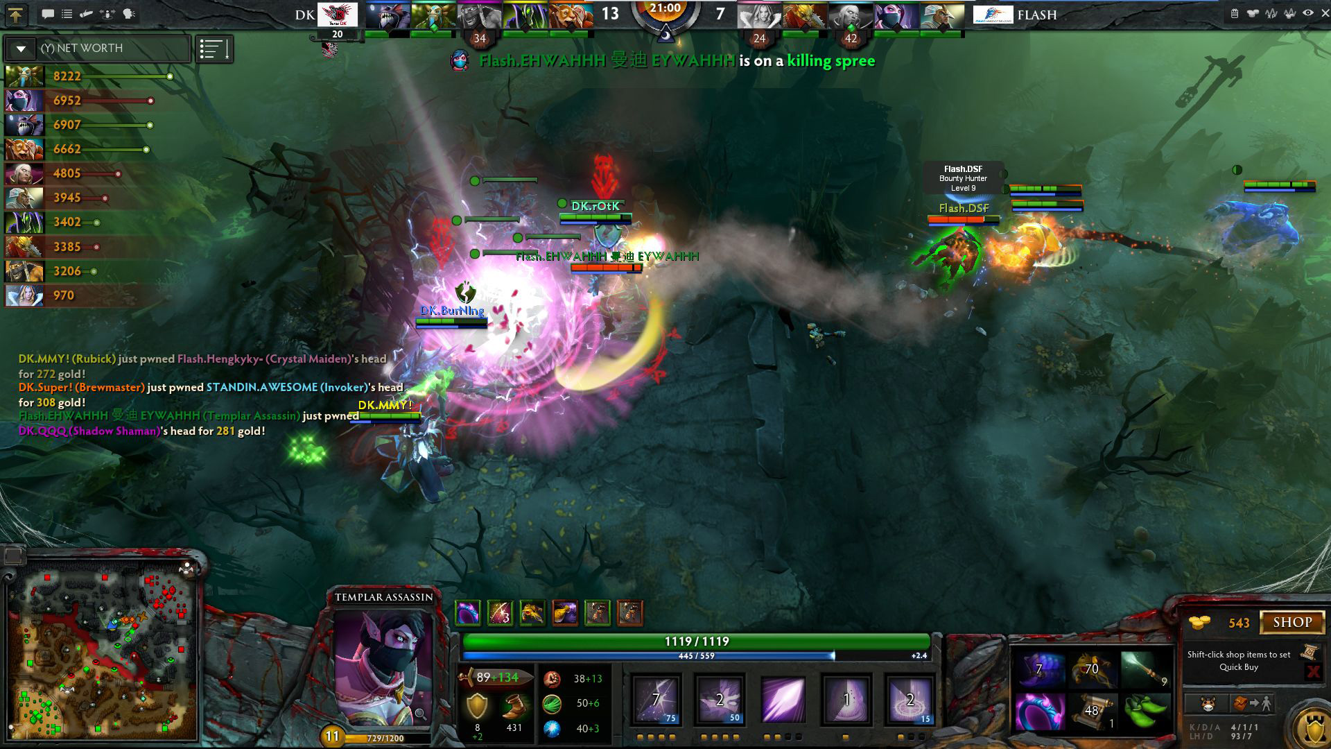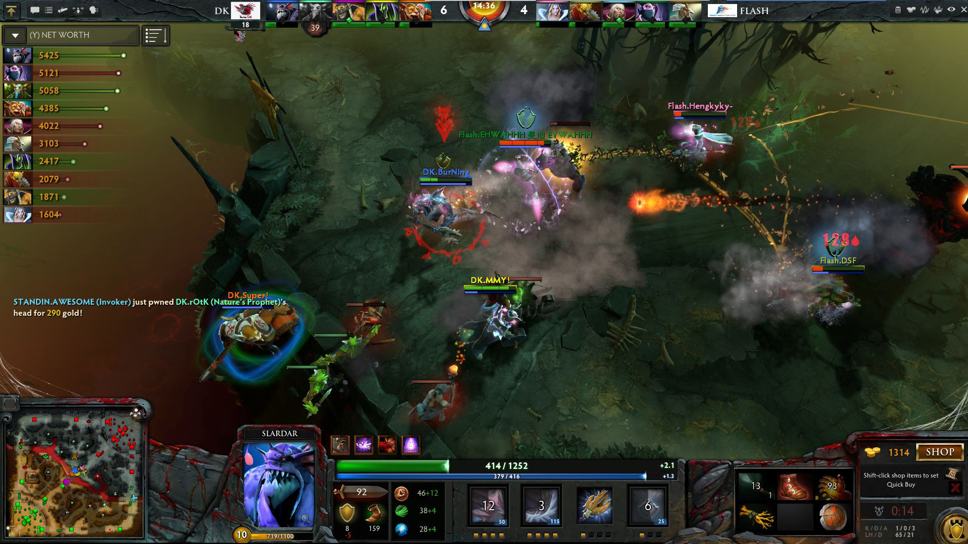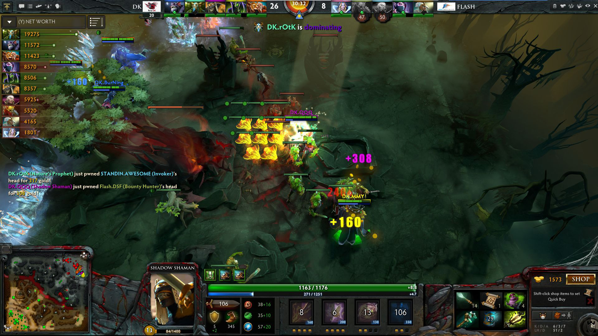 拿到盾后,神装B神带领DK进逼flash下路二塔,曼迪开启BKB果断切入,无奈B神的输出过于恐怖,曼迪的TA只好退却,往返之间,flash除了曼迪之外全灭,DK无伤0换4,中路兵线完美,转战中路上高地拆掉建筑,flash见翻盘无望打出GG,同时准备着下一盘的绝地反击。