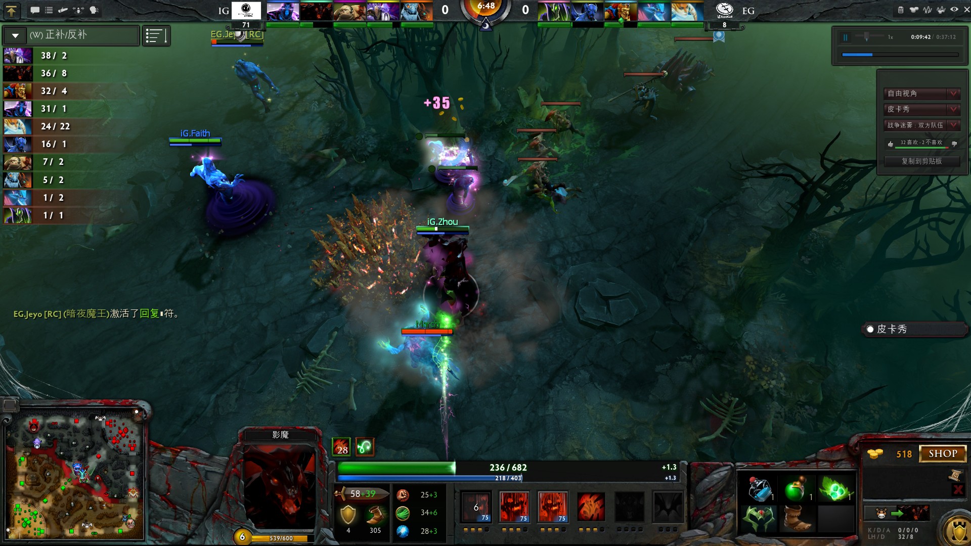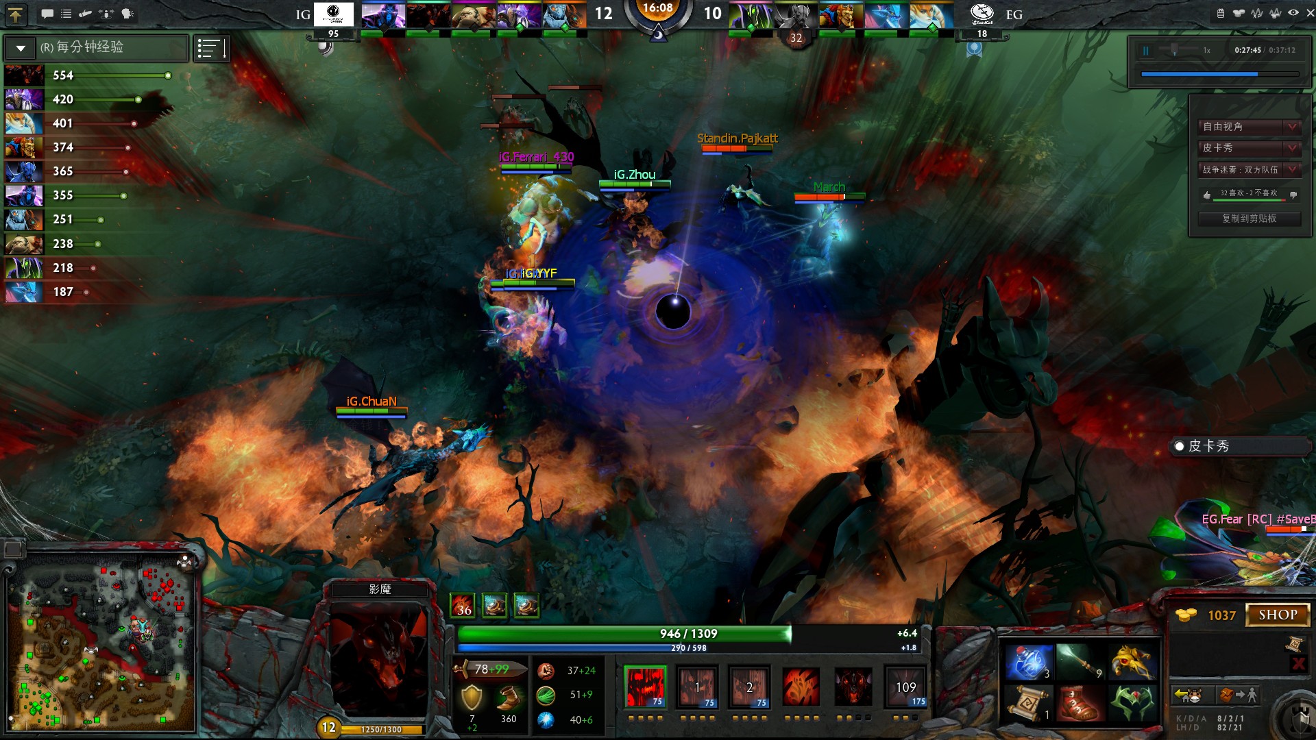 16分钟的时候,双方在EG中路二塔遭遇,IG依靠BKB影魔强势团灭EG战队,双方经济拉大到了一万块钱。