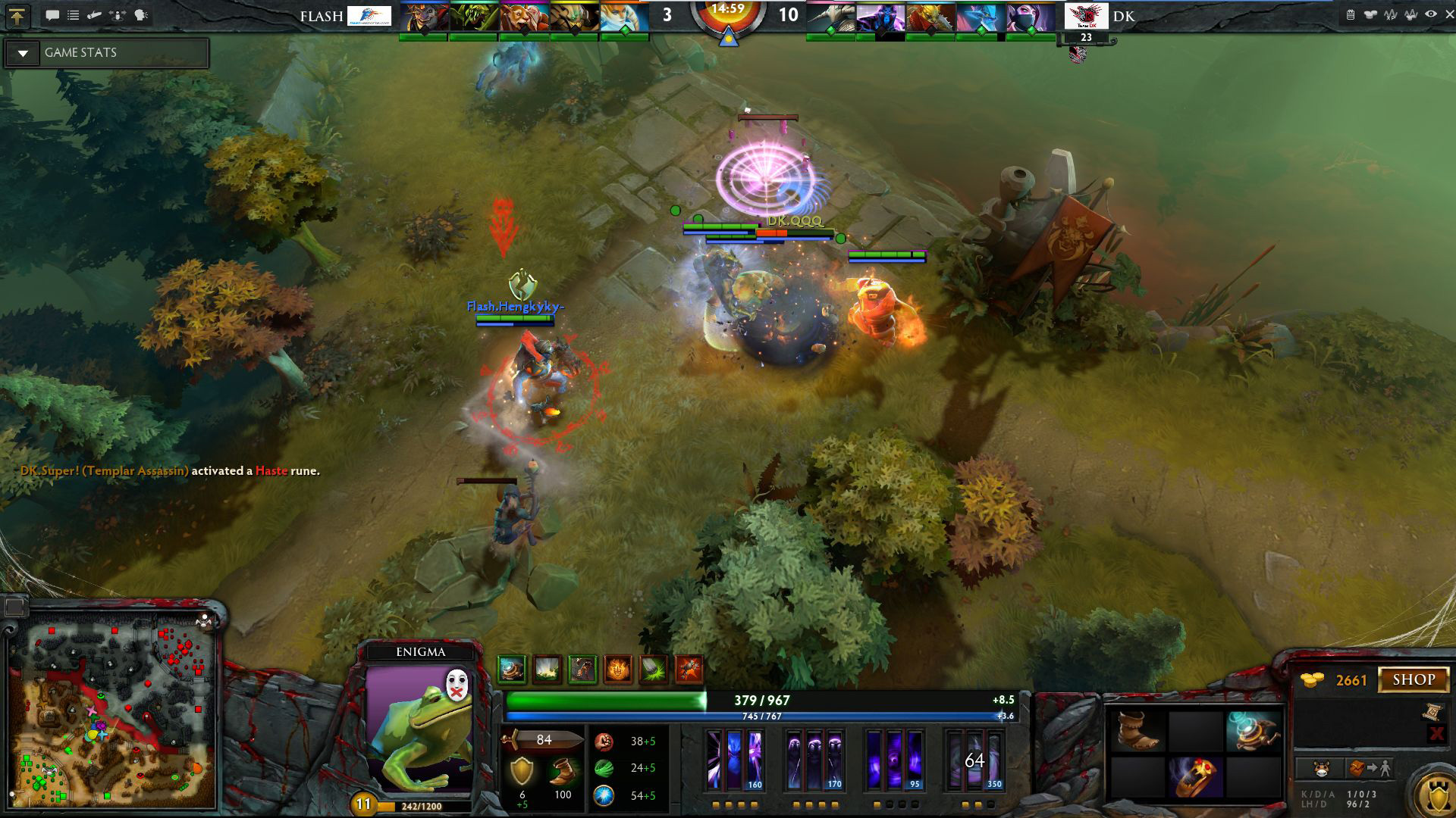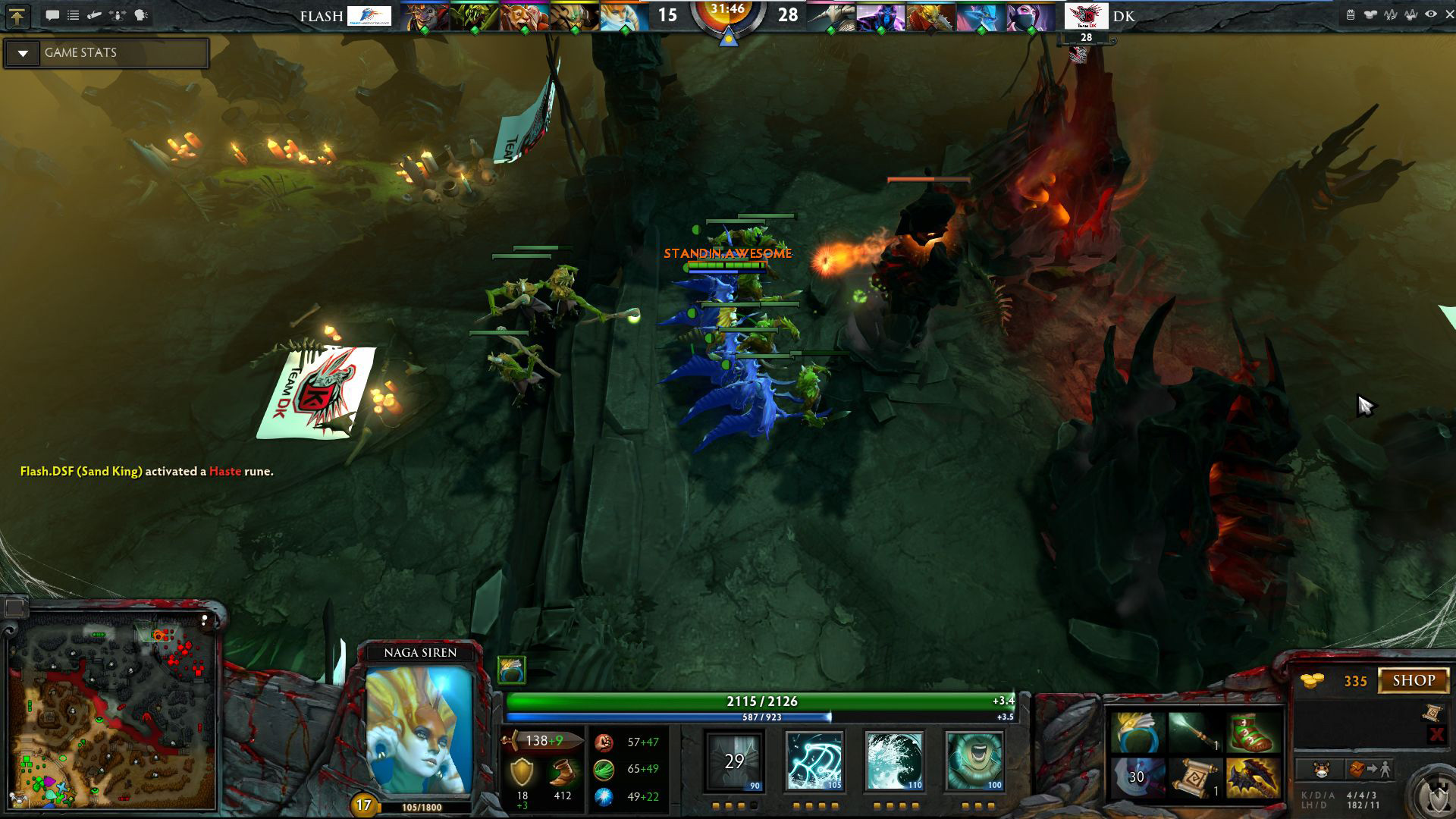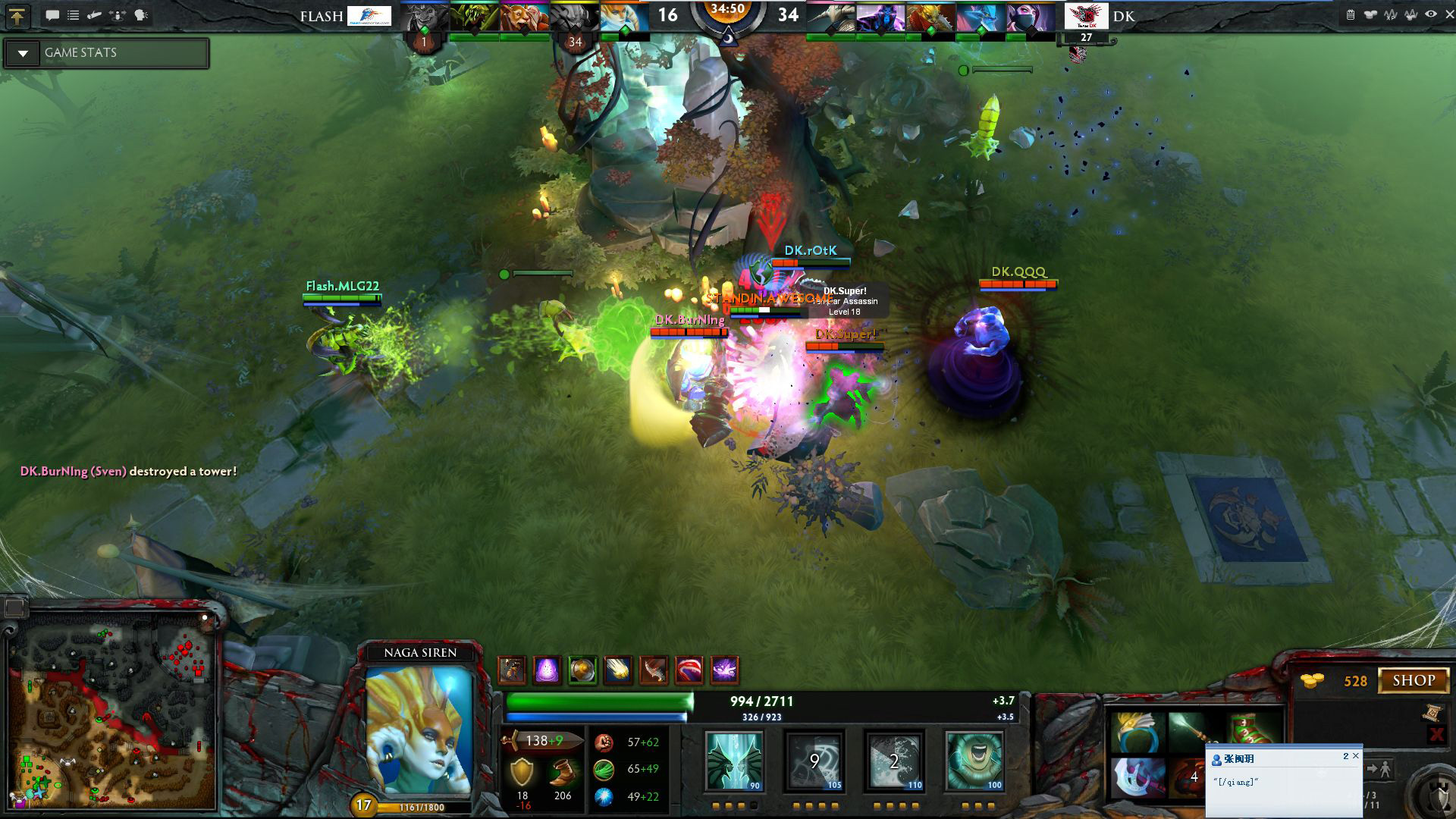 不像上一盘比赛的N9,到后期毫无战意,Flash毫不在意自己与DK实力的差距,非常顽强的继续反击,虽然被B神神装的Sven多次斩杀,虽然被谜团多次漂亮的大招无奈团灭,Flash还是一次又一次的站起来,冲出高地,有一次成功地抓死B神,让我们看到了Flash拼死一战而不想进入慢性死亡的决心。30分钟后,DK打完肉山,下路推进,凶猛的战车毫不在意Flash零星的抵抗,小娜迦只好拼命推上路,与DK互换,当小娜迦转身推中路时,围魏救赵终于成功,DK集体回城,谜团被不幸留下,Flash击杀了谜团。