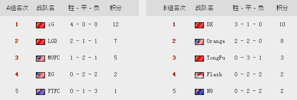 A组iG以小组全胜战绩积12分傲视群雄,LGD积7分和iG一起进入胜者组。B组的DK也以不败战绩遥遥领先,和第二名的橘子一同晋级胜者组,他们将分别面对A组霸主iG和老干爹。MUFC和EG分别代表A组进入了败者组的比赛,同福将面对EG,这支战队可是远比B组的外国战队强大许多,对同福的表现略表担忧。Flash和N9评分,胜负也打平,由于Flash在对阵N9时获胜的时间比N9打赢Flash的时间来的短,因此N9被淘汰,Flash惊险晋级,个人而言还是更喜欢Flash的拼劲,他们晋级会让比赛更加好看。面对MUFC,Flash劣势明显,能否爆冷要看曼迪的发挥,但是在女王被第一时间Ban掉的比赛中,曼迪能否带领Flash前进?