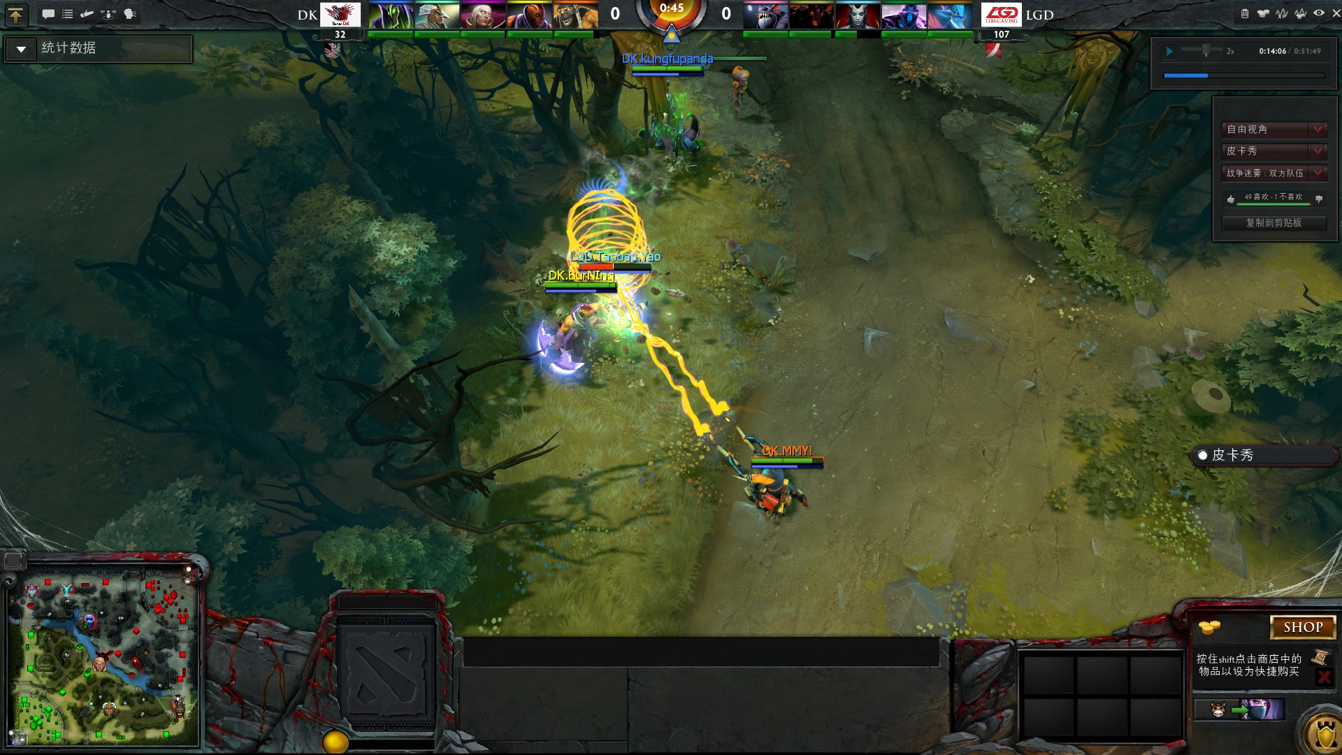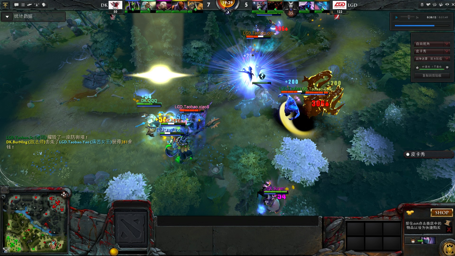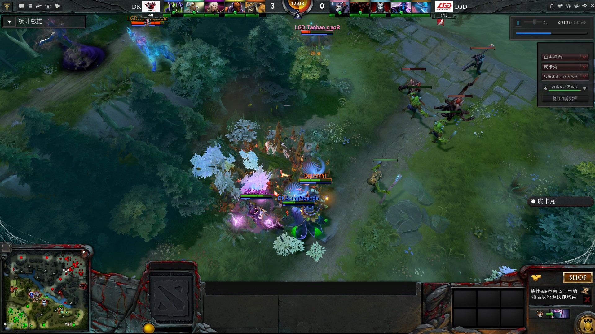 12分钟,DK抓住中路补刀的鱼人,但是被TS的一个T打断,LGD反打一波,击杀了DK的3个人。之后LGD开雾偷掉了Roshan。