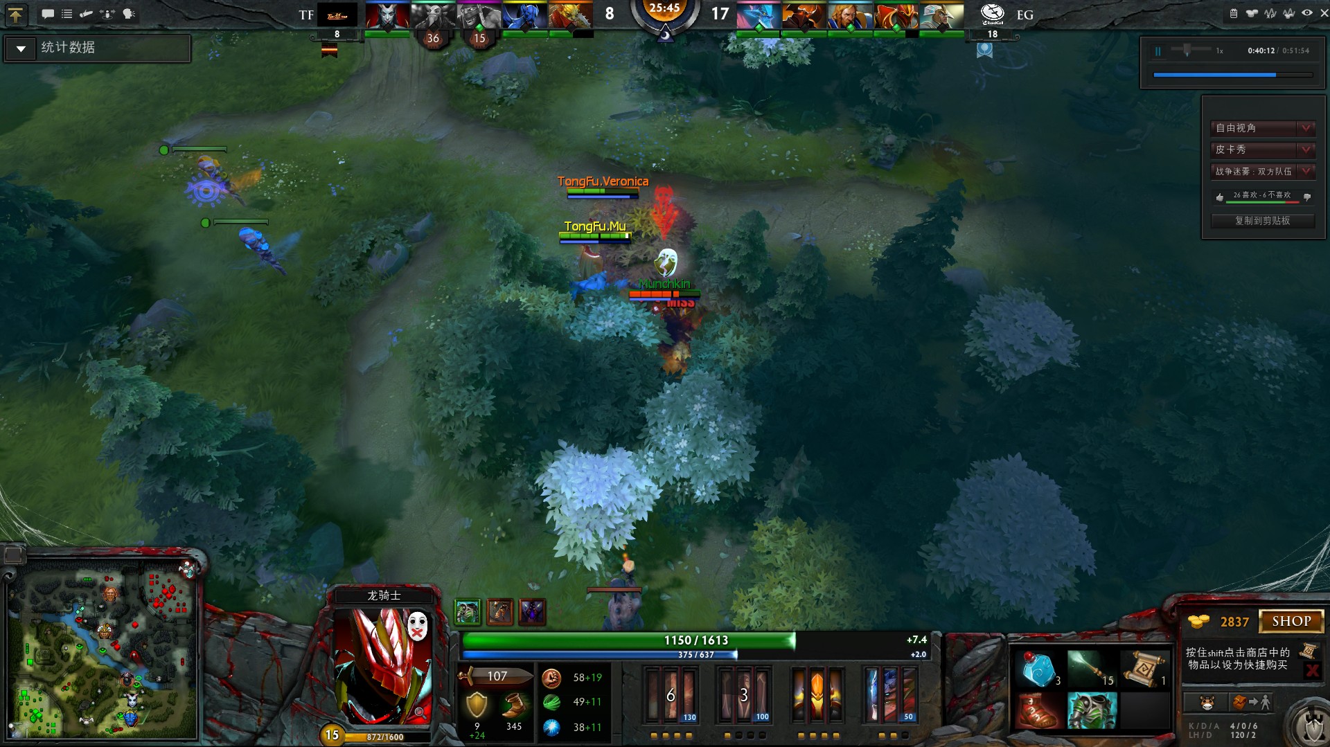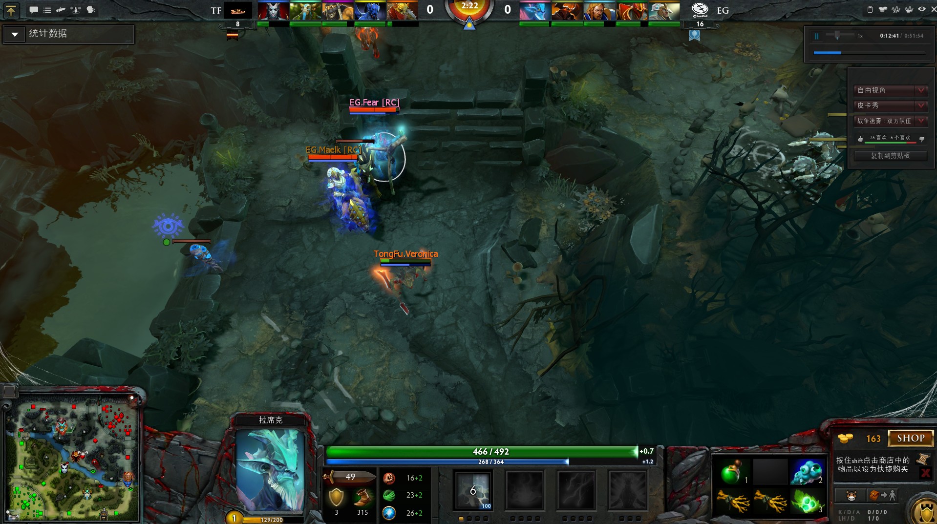 12分钟,双方在中路河道遭遇,由于前期EG占有等级和装备上的优势,在暗影萨满被秒之后,夜魔被晕了4秒,同福局面奔溃,最终EG以全能和陈的代价,换掉了对面4个人头。