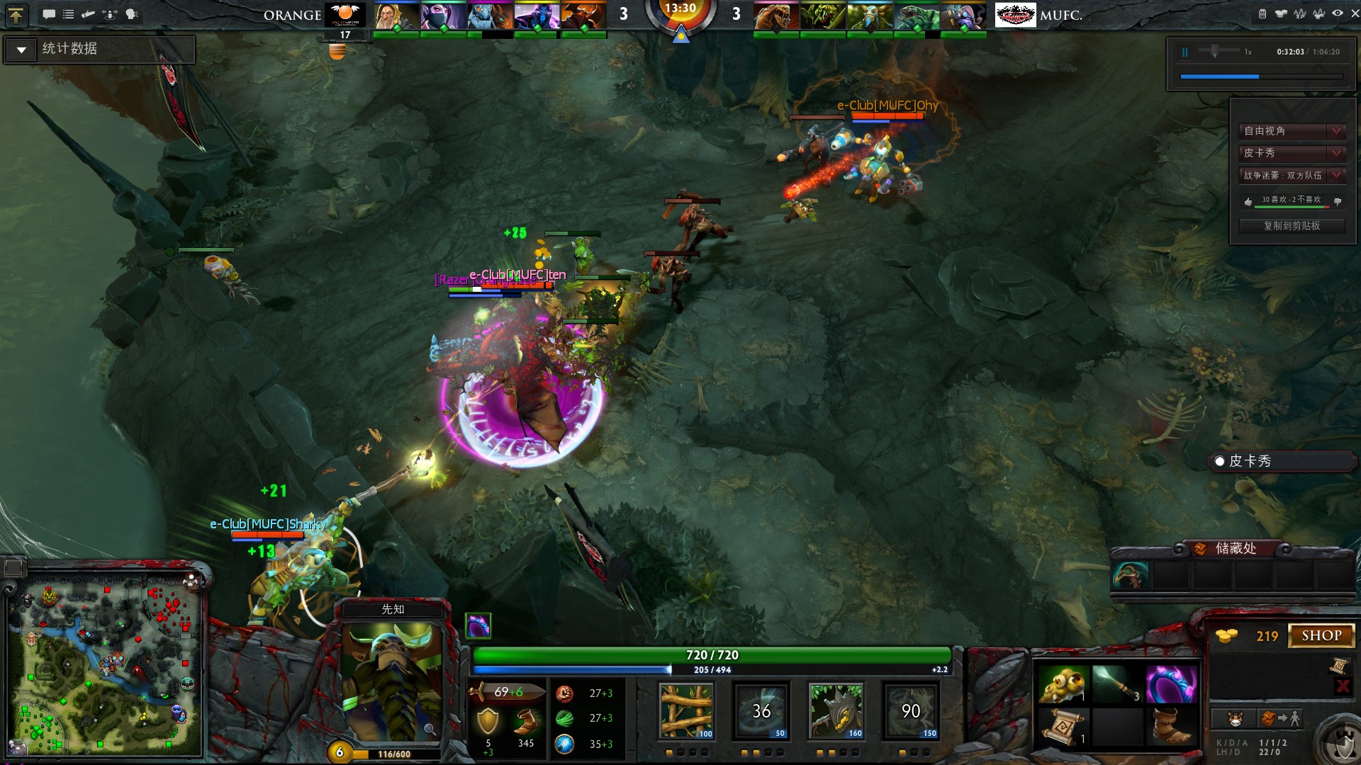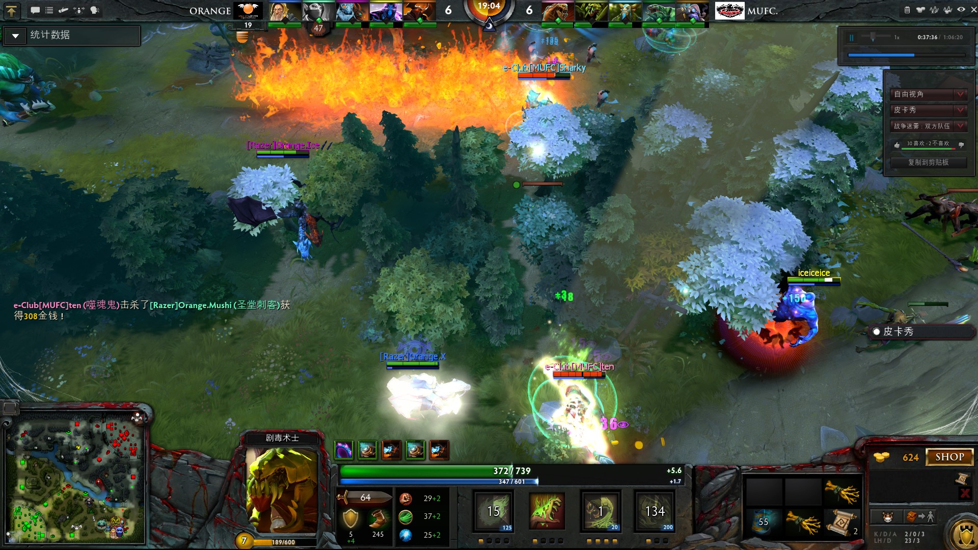 19分钟,MUFC在天辉一塔处遭遇了Orange,先手击杀了圣堂刺客,但是Mushi果断买活TP,一举扭转局面,先后击杀了小狗剧毒潮汐和修补匠,打了MUFC一波小团灭。