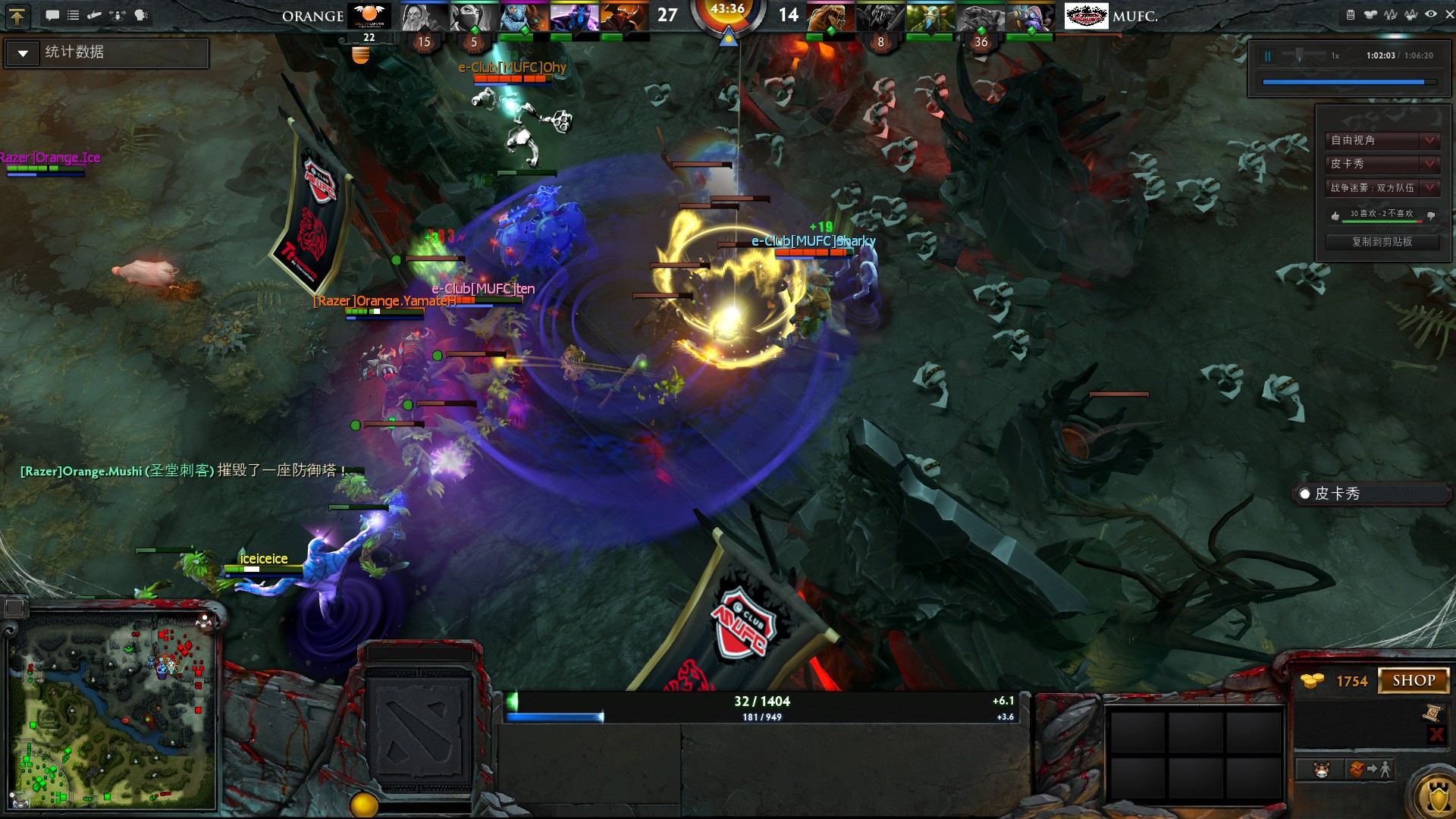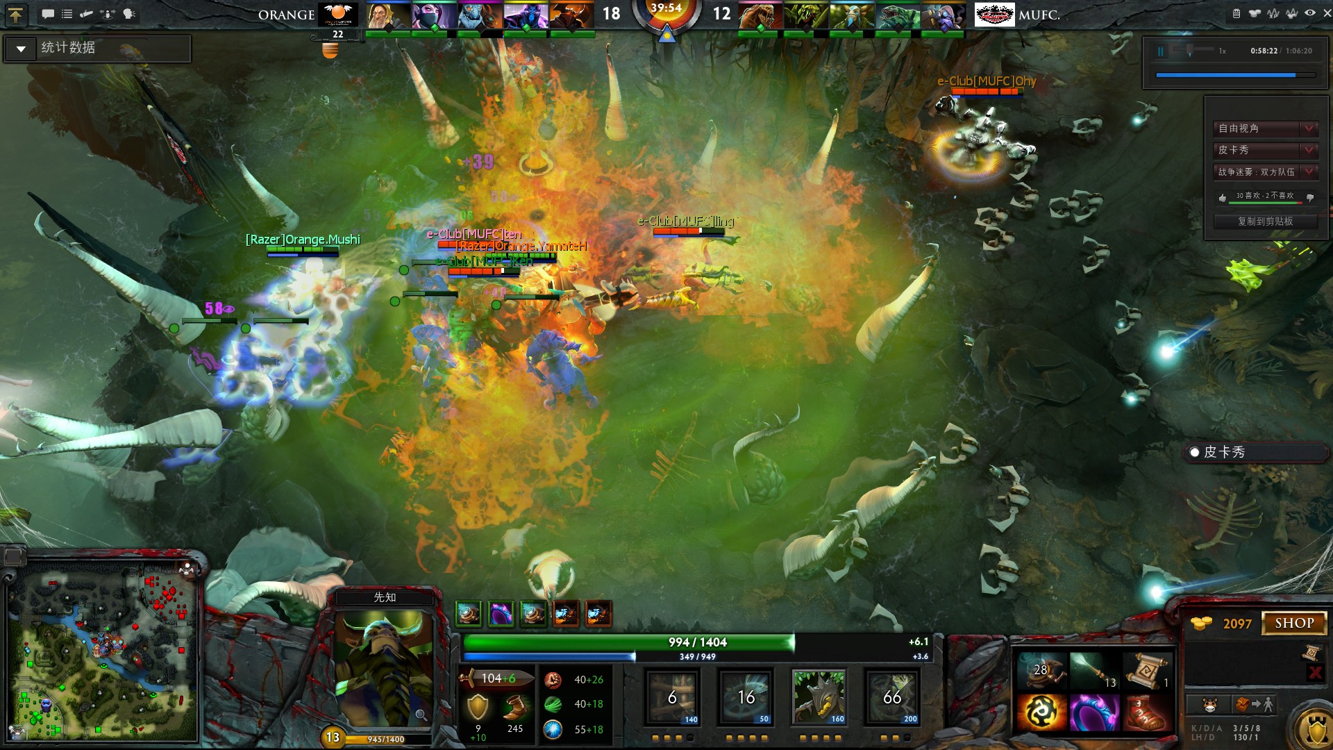 40分钟,MUFC打Roshan被Orange发现,双方中路爆发团战,但是神装的圣堂刺客和混沌骑士输出非常高,瞬间秒杀小狗,正面战场全线溃败,被打了一波小团灭,Mushi拿下Roshan盾。