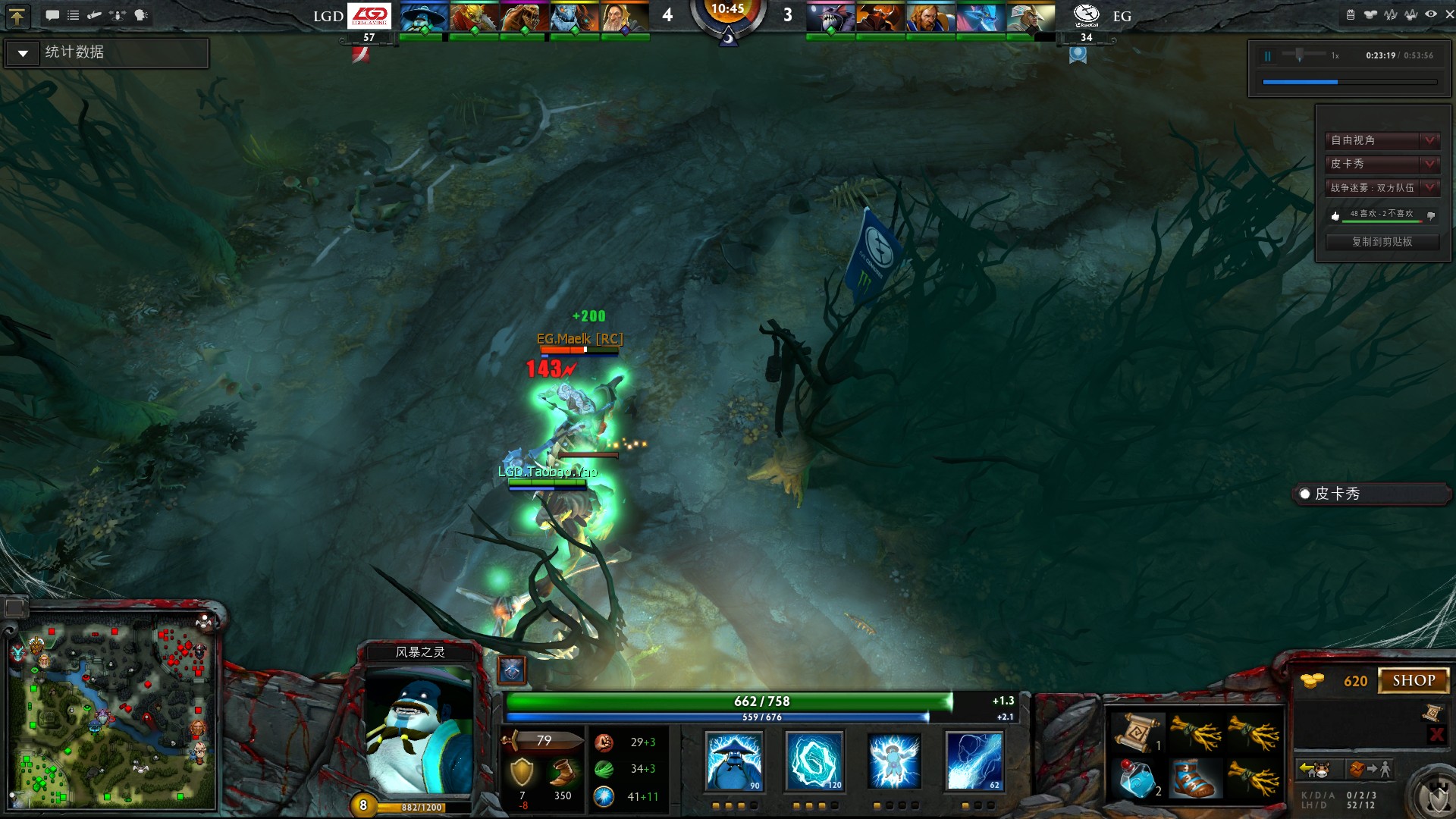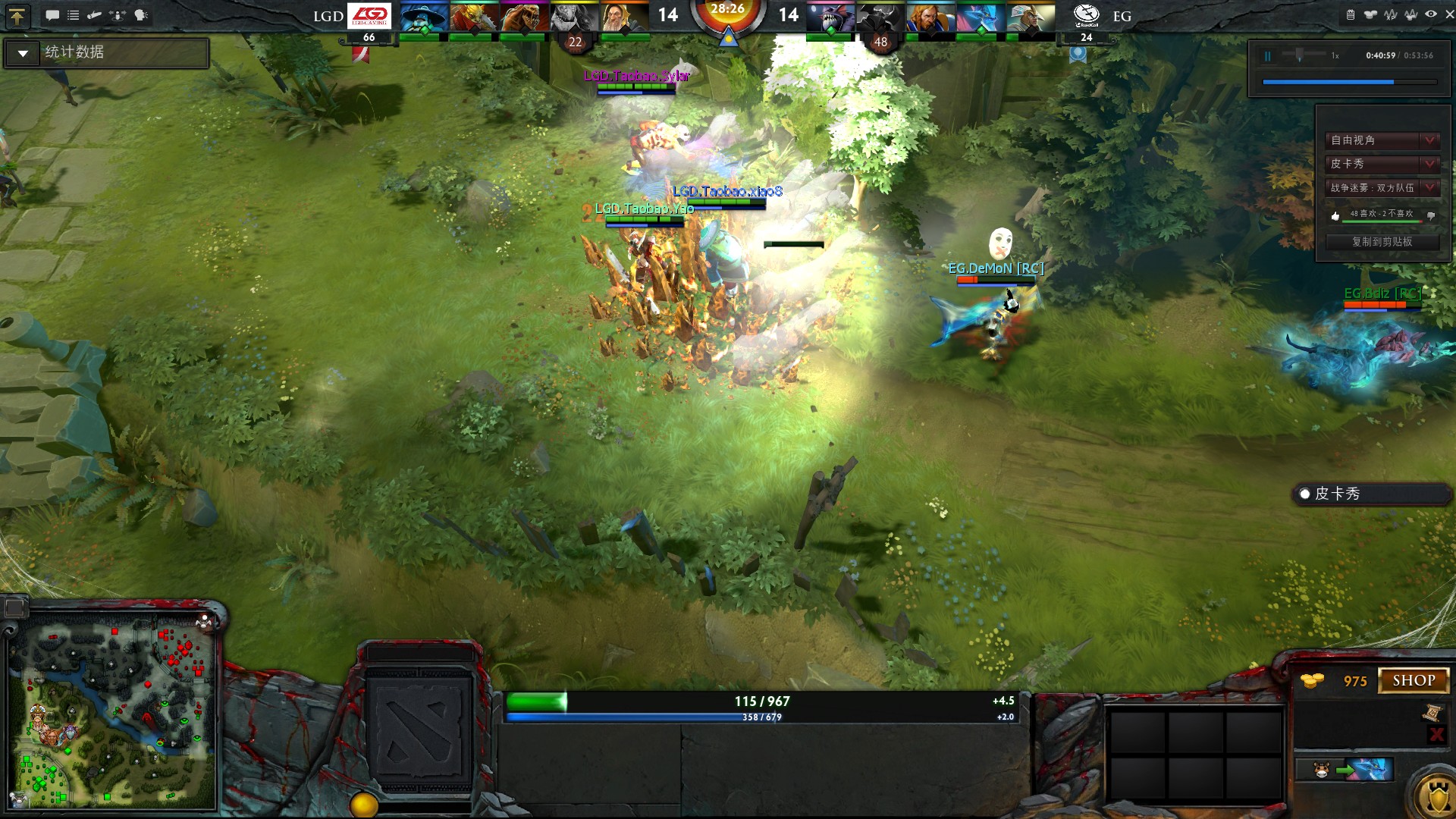10分钟,光法一个漂亮的站位,配合赏金大**死陈,此时LGD的小狗已经点金在手,身带巨款,LGD逐渐掌握场上的局面。