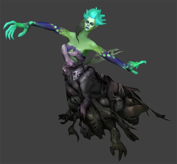 敌法师和风行者的套装都有自定义的动画,与此类似,死亡先知的万圣节风格套装“尸骸室女”套装也有自己的自定义动画。