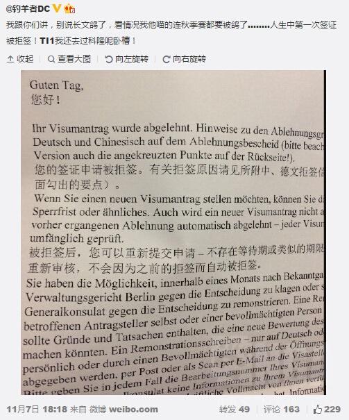 我跟你们讲,被说长文鸽了,看情况我他喵的连秋季赛都要被鸽了......人生中第一次签证被拒签!TI1我还去过科隆呢卧槽!