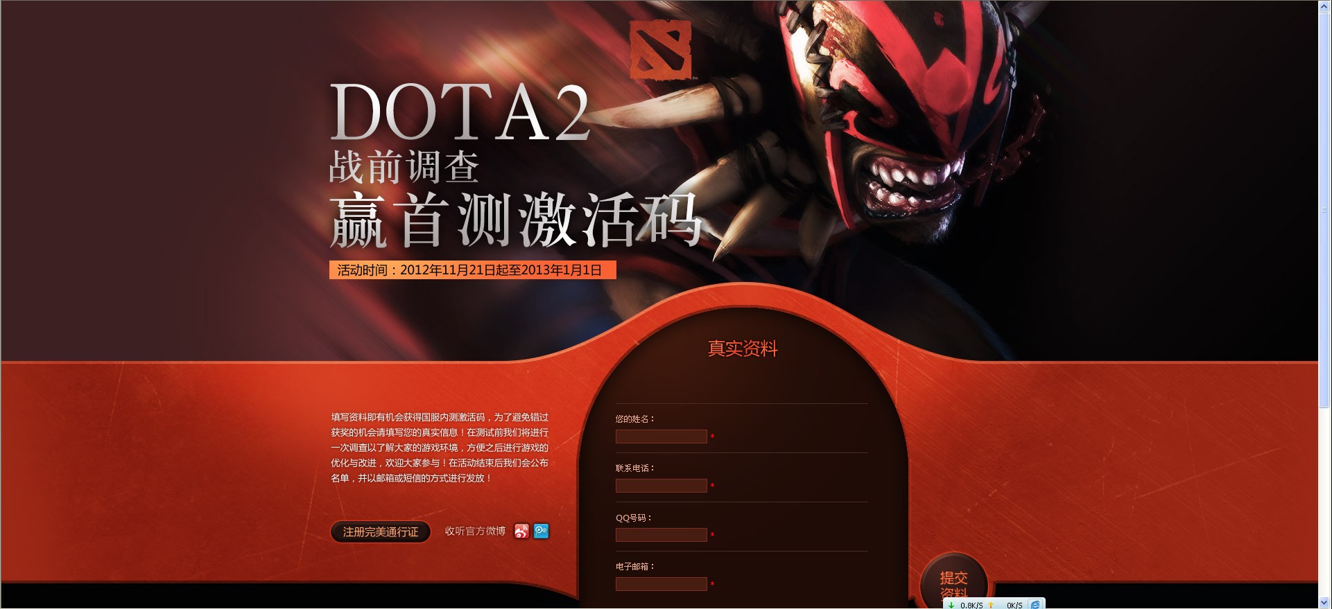 就在今天,完美Dota2官网上赫然出现了一个国服战前的调查表,清楚的写着“Dota2战前调查赢首测激活码”,调查的活动时间是从2012年11月21号-2013年1月1号,由此我们可以推测出,或许2013年的元旦,将会是国服的上线时间,届时国服神秘的面纱也将一一为我们揭开。
