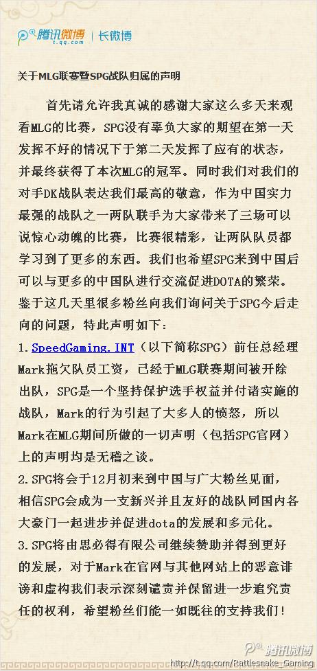 今日知名DOTA2解说老七在微博上询问SPG是否还会来中国,得到RSNAKE官方微博回复。官方微博称SPG前任经理发表的声明属恶意诽谤并妄图阻止SPG进入中国。并称在MLG比赛后,会有详细的解释。