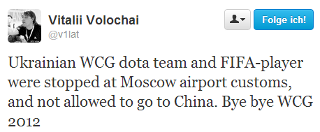 而根据知名俄语解说与赛事组织者v1lat的消息,似乎目前乌克兰队已经和WCG说拜拜了。参加DOTA2项目与FIFA项目的乌克兰选手全部受阻于莫斯科国际机场,将不能参加WCG2012的比赛。