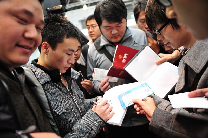 Dendi及其NAVI队的两位队友在完美展台与国内知名解说精灵签名合影