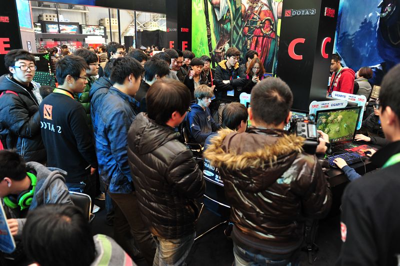 玩家聚集在DOTA2试玩区,等位期间看其他玩家试玩玩得津津有味