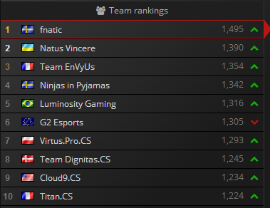 上图是CSGO的世界排名,fnatic战队稳居榜首,NAVI紧随其后。而反观DOTA2这边的情况: