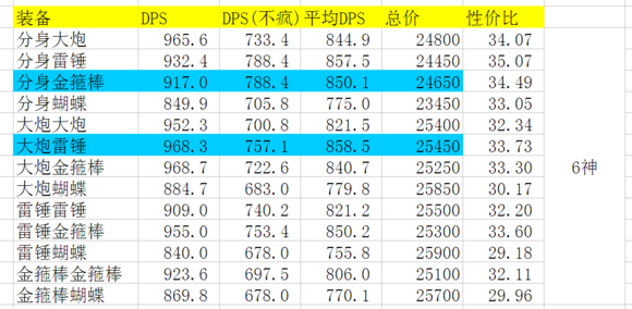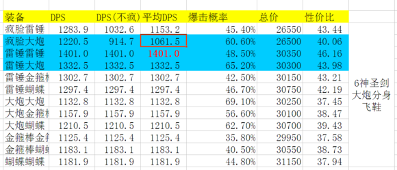 好多啊,数据顺序是平均DPS 、疯脸开启时的DPS 、花费、 性价比