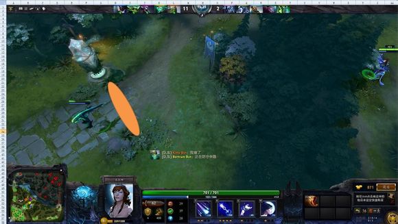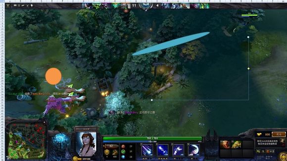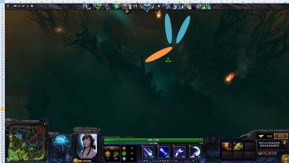 夜魇方二塔攻击箭,由于从树林中射过,反应时间很短.蓝色为射箭方向,橘色圆圈瞄准的位置